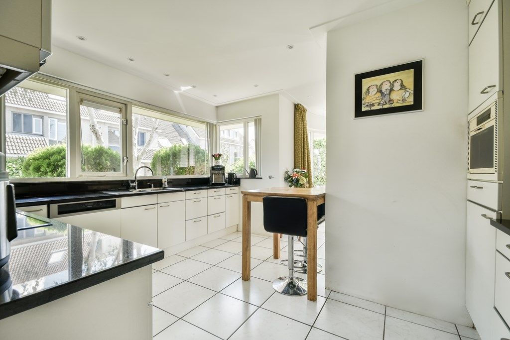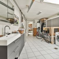 From the central hall, the living room, separate toilet and laundry room with washing machine, dryer and extra fridge-freezer are accessible. There is also access to the spacious garage and workshop/bicycle storage. The spacious living room offers plenty of natural light through the large windows and various seating areas. Sliding doors provide access to the large, sunny garden. The open kitchen is equipped with a new induction hob, new oven, dishwasher, microwave and ample storage space.
