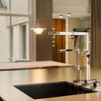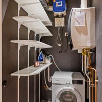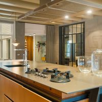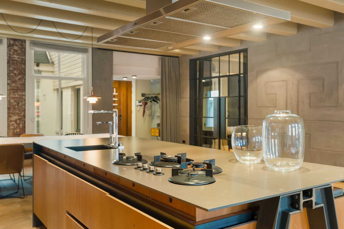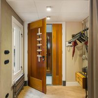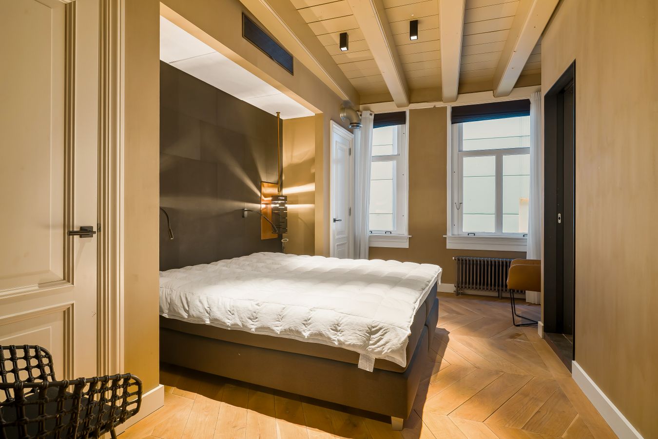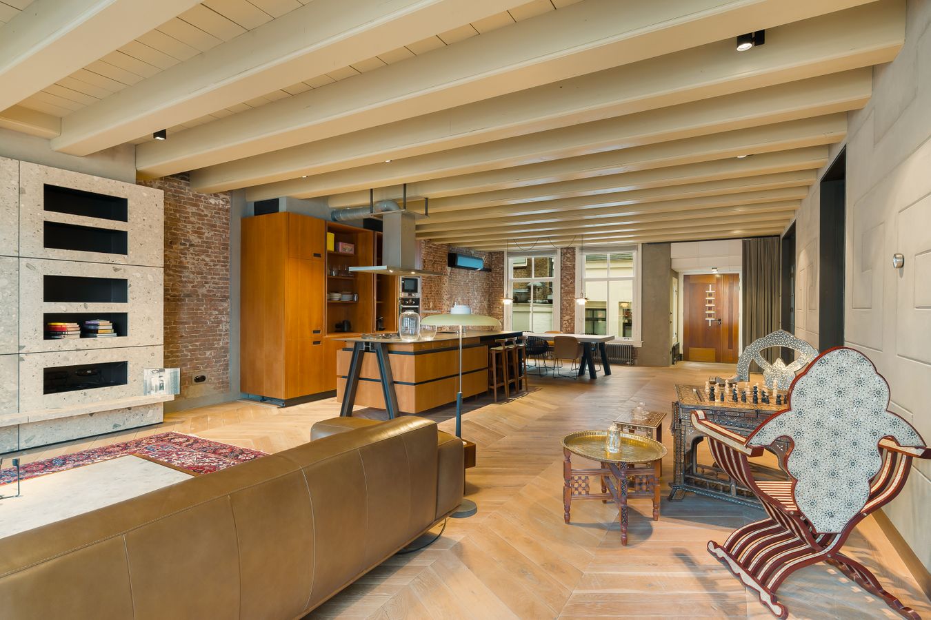 The well-maintained staircase or modern lift takes you to the entrance of the apartment, located on the 3rd floor. The spacious and bright living room with beautiful wooden floors and a balcony ceiling has high windows and an open layout, creating a pleasant and spacious atmosphere. The open kitchen is modern and equipped with high-quality built-in appliances, including a dishwasher, 4-burner gas stove, combi-oven and a fridge-freezer. The cooking island with bar offers a cosy place for breakfast or a glass of wine while cooking.