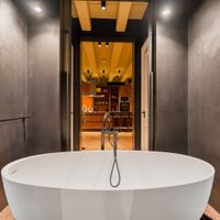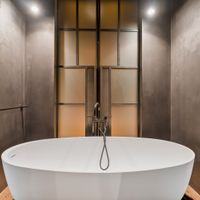 The spacious bedroom has practical built-in cupboard space and offers enough room for a large double bed. The modern bathroom exudes luxury with a freestanding bathtub and a spacious walk-in shower.