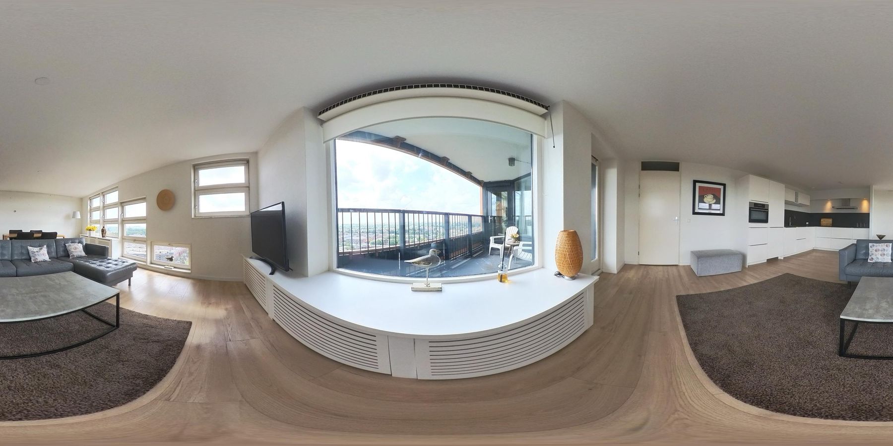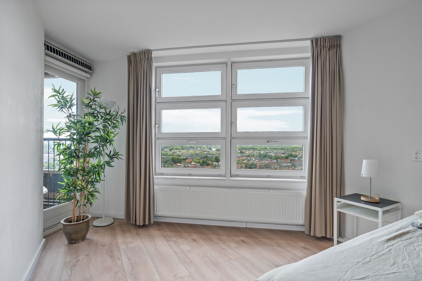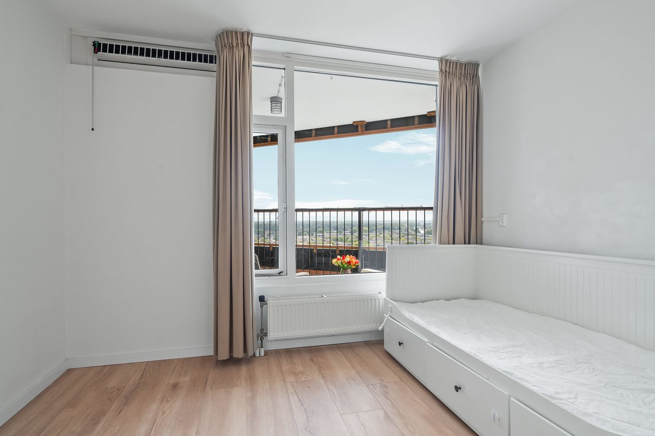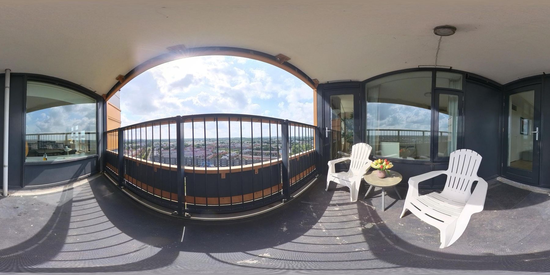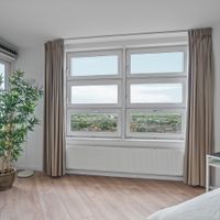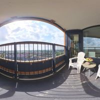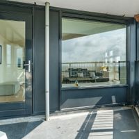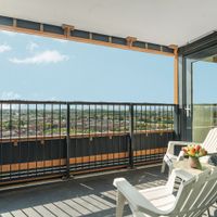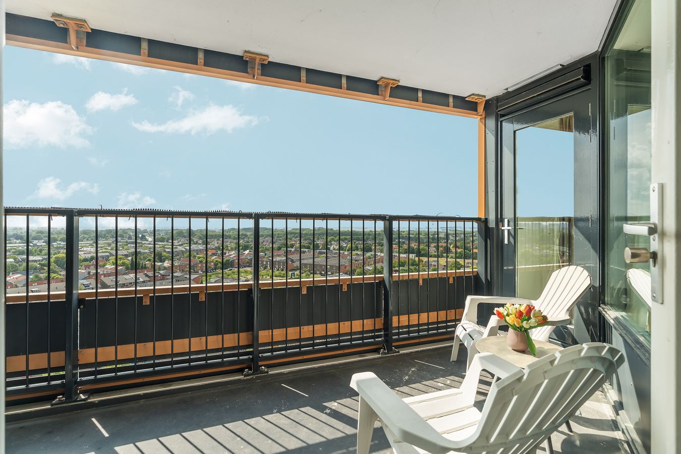 The balcony faces south. Here you can sit in the sun all day and enjoy the beautiful view of the Zuidas, the Amsterdamse Bos, and Schiphol Airport.