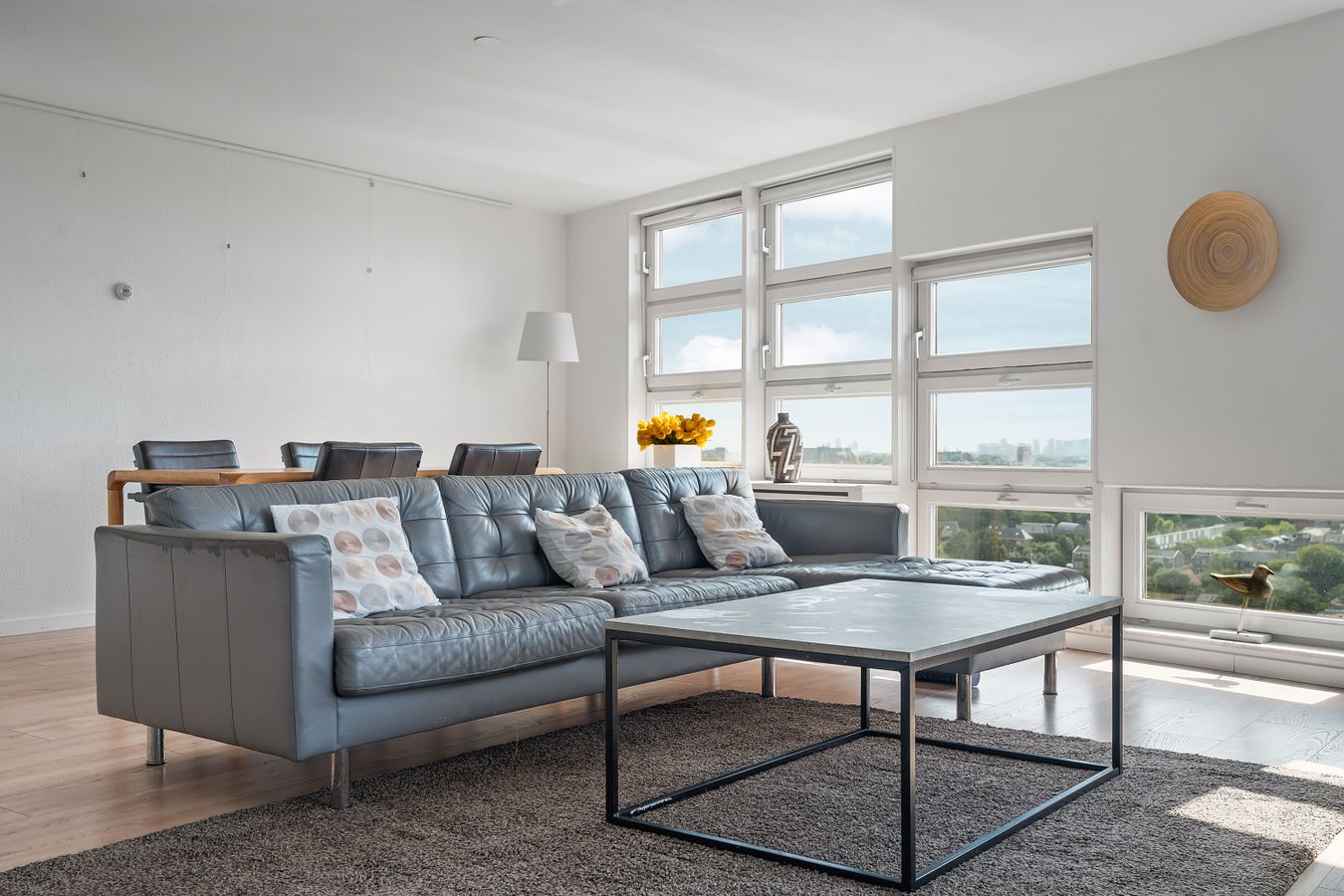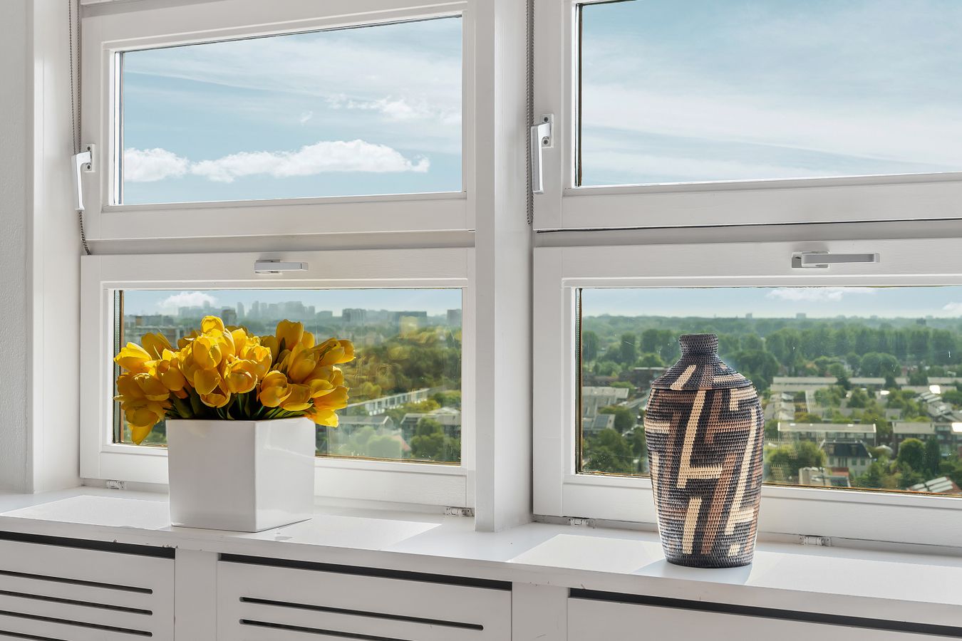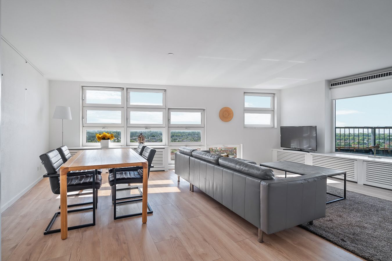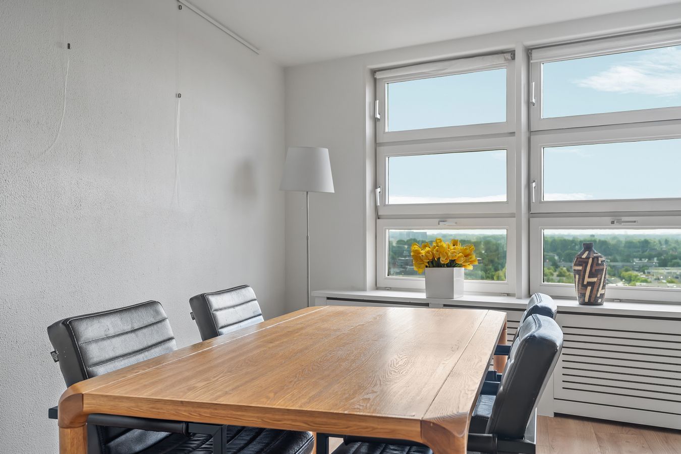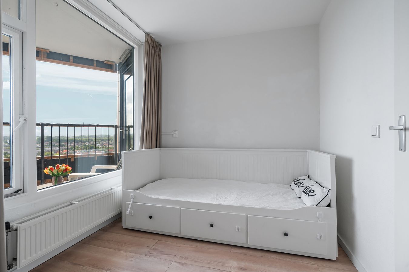 The balcony faces south. Here you can sit in the sun all day and enjoy the beautiful view of the Zuidas, the Amsterdamse Bos, and Schiphol Airport.
