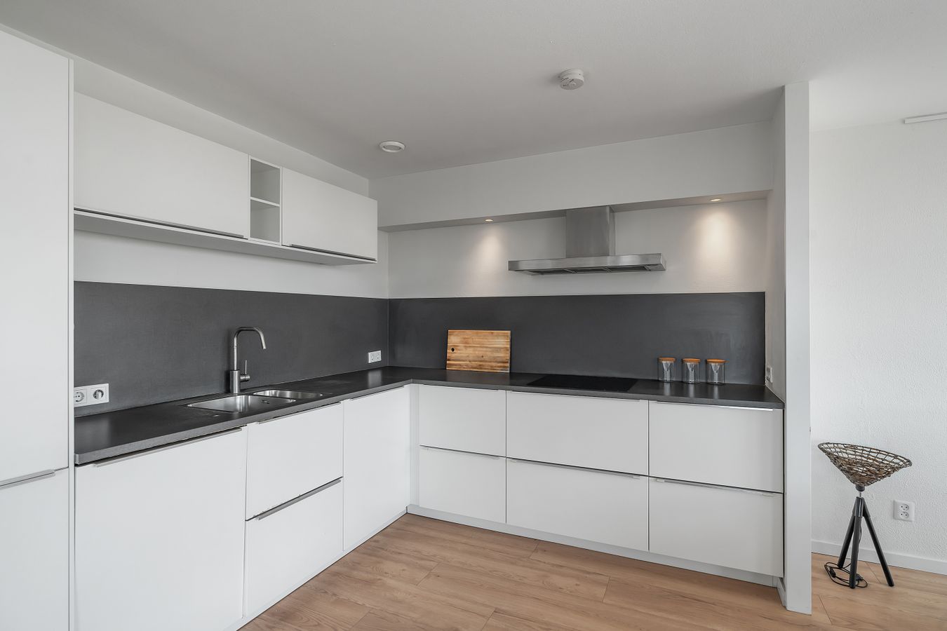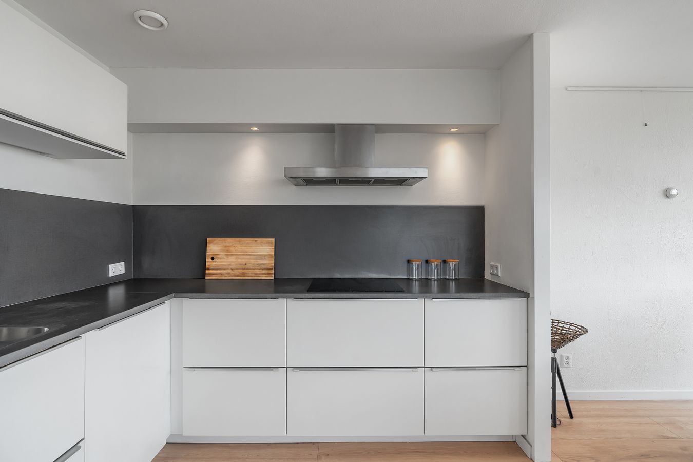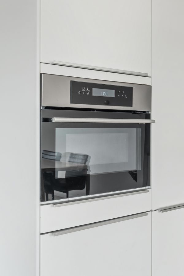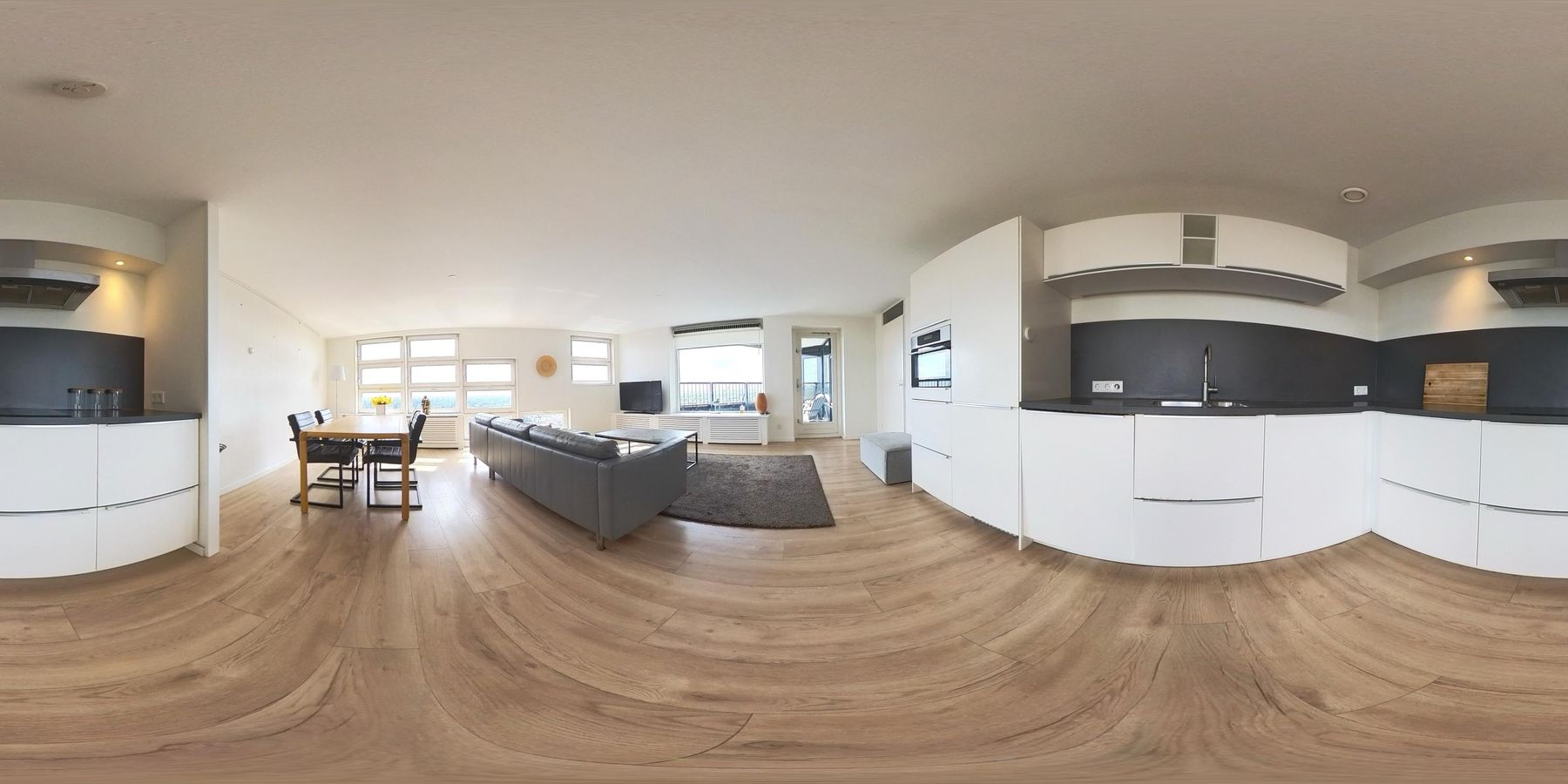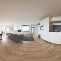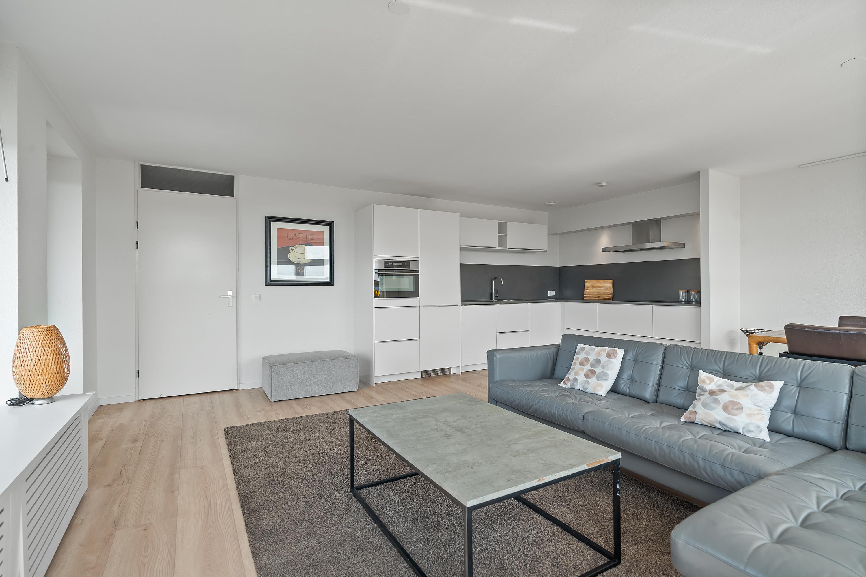 The very spacious living room with open kitchen is located on the south side of the building and therefore offers plenty of daylight. The many windows make it a very bright space. The open kitchen was installed in 2018 and offers built-in appliances such as a dishwasher, combi-oven, induction hob, and fridge-freezer. In addition, there is ample storage space.