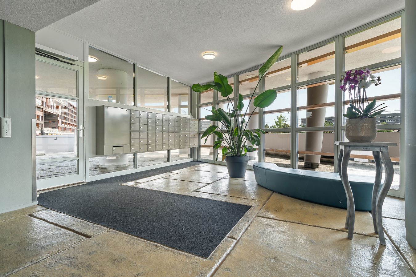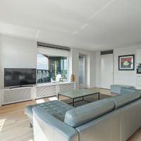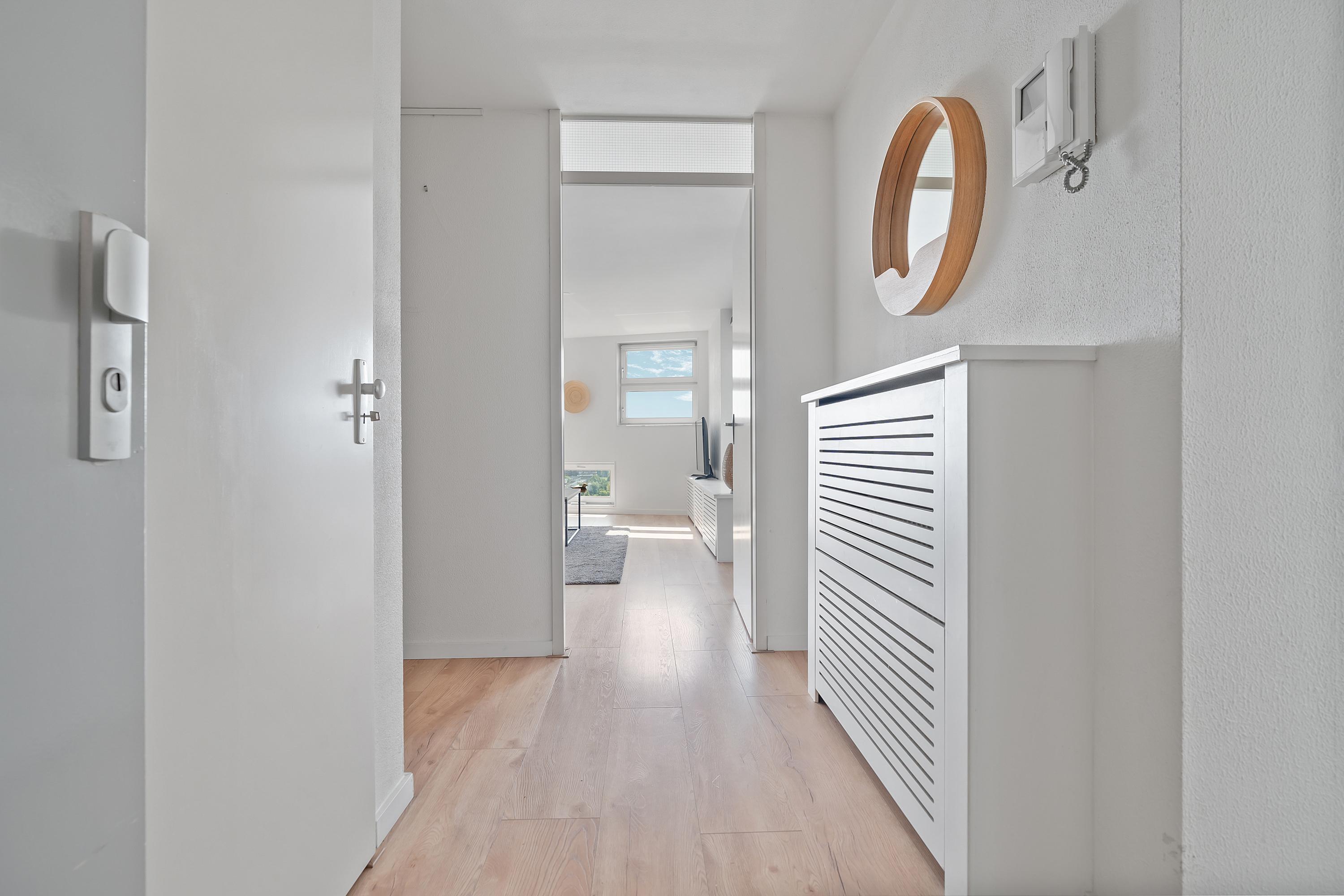 The central entrance to the building is on Ecuplein. Two elevators take you to the apartment on the fifteenth floor. You enter into a spacious hall that provides access to all rooms.