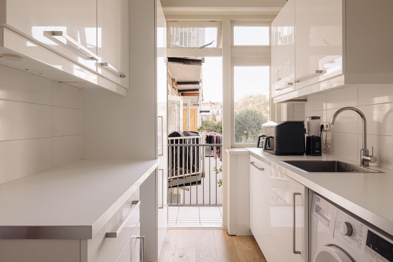 At the rear is the modern kitchen, fully equipped with built-in appliances such as a refrigerator, freezer, dishwasher, oven-microwave combination, hob and extractor hood. The connection for the washing machine is conveniently located so that the washing machine can be placed in the cupboard space. The balcony can also be accessed via the kitchen.