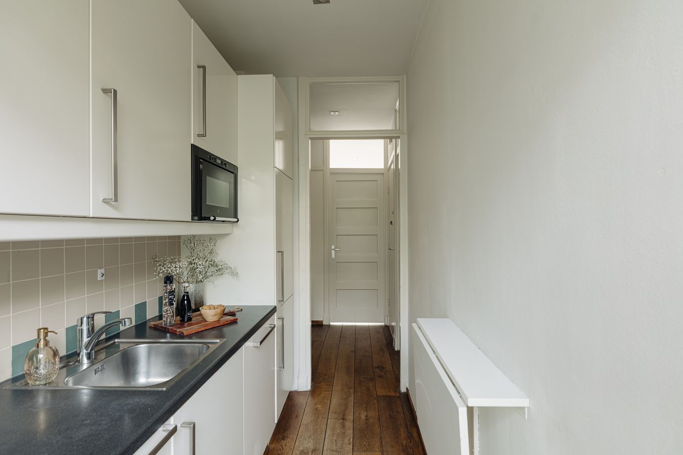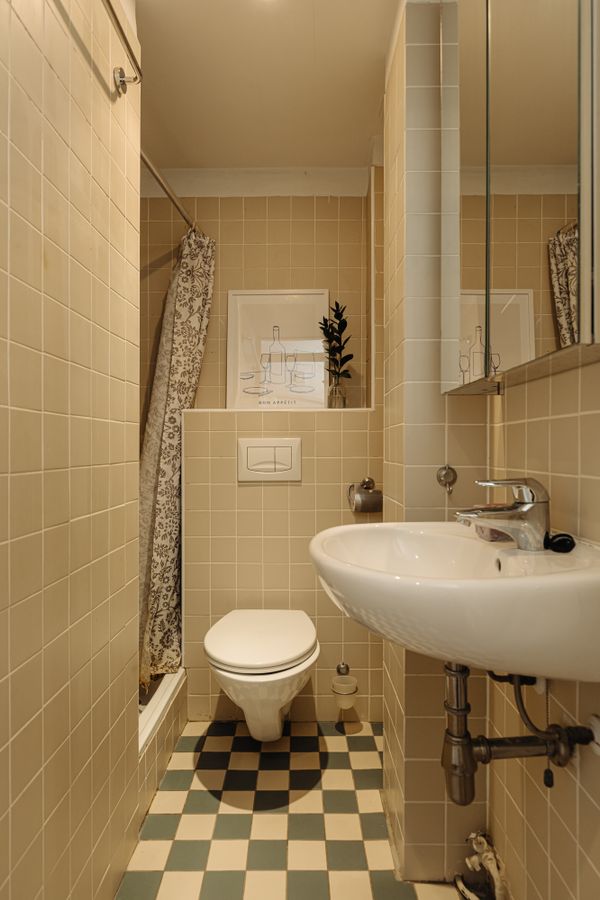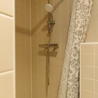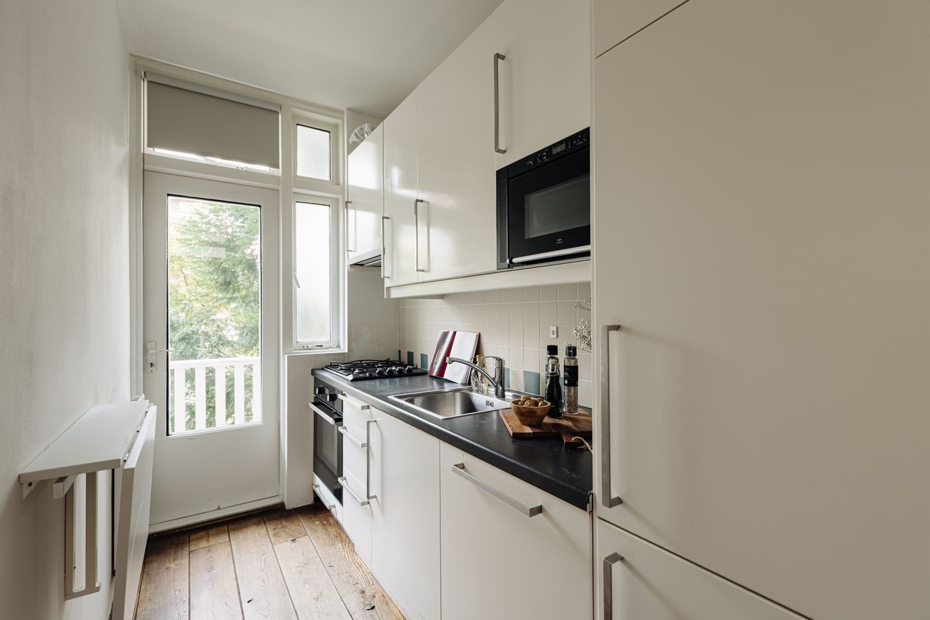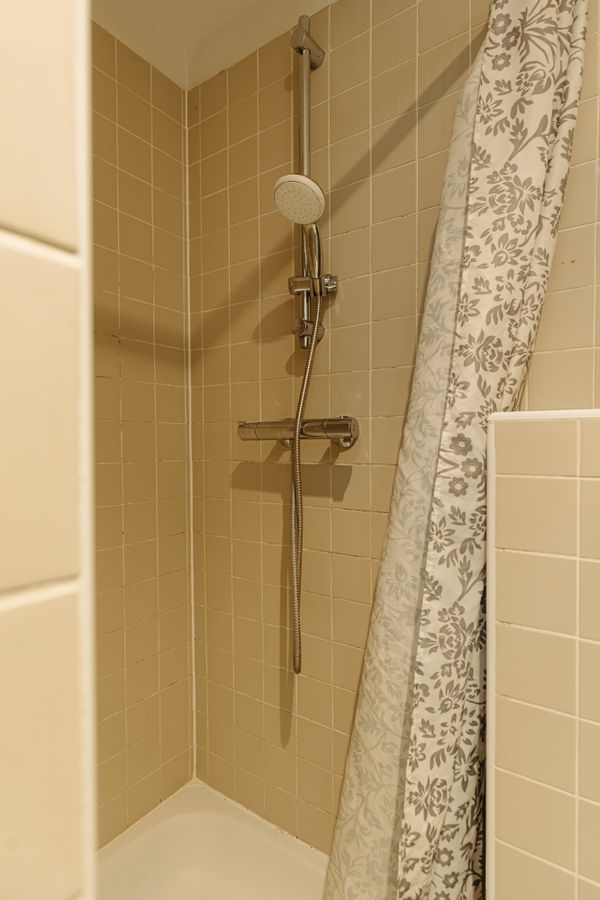 The kitchen is equipped with built-in appliances such as an oven and microwave, 4-burner gas stove, dishwasher, and refrigerator and freezer. Finally, the balcony can also be accessed from this room. The balcony extends across the width of the flat and faces west, which means that the sun shines on the balcony from late afternoon onwards. The central heating boiler is also located here. The bathroom is located in the middle of the flat and has a shower, washbasin, towel radiator and toilet.