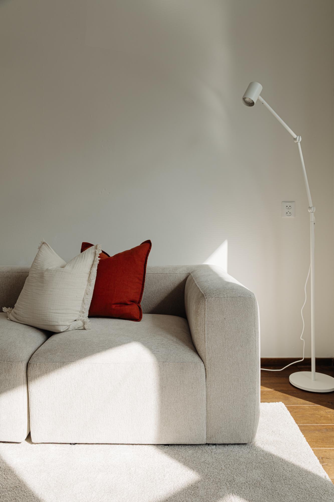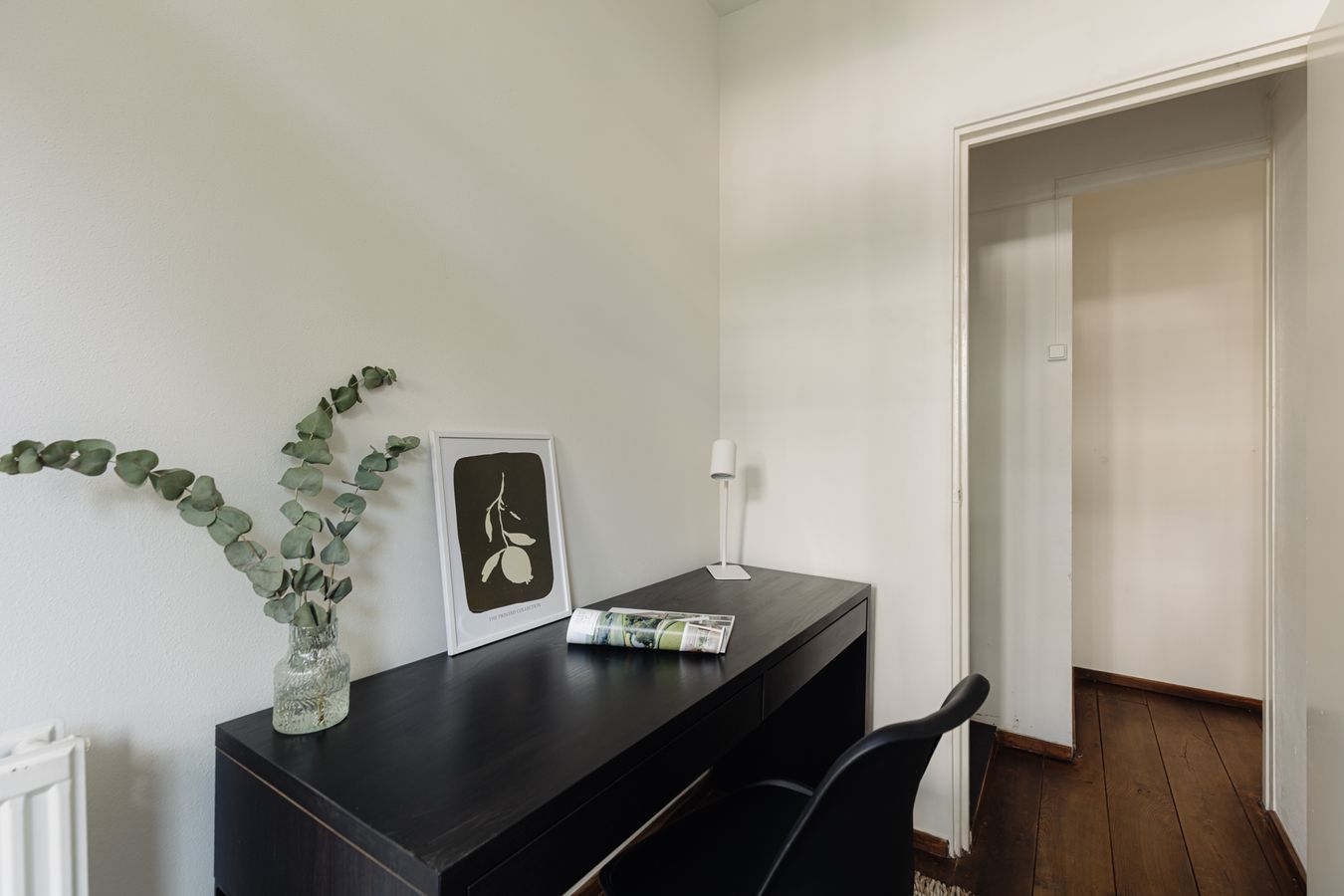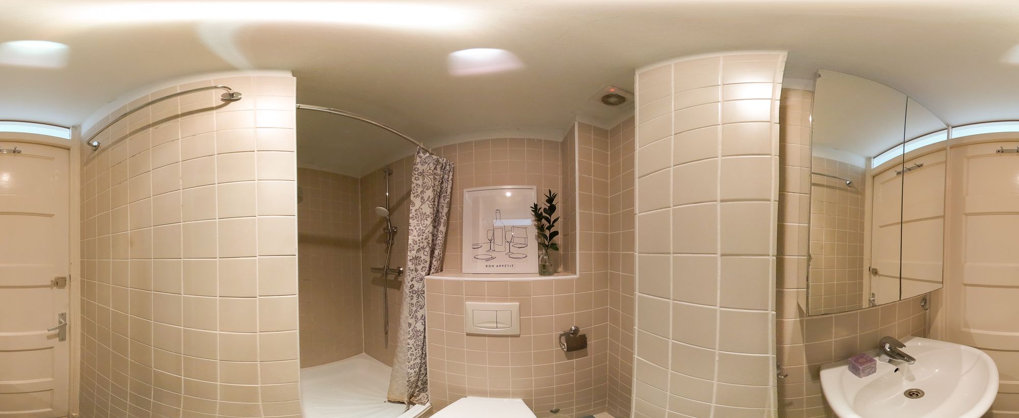 The kitchen is equipped with built-in appliances such as an oven and microwave, 4-burner gas stove, dishwasher, and refrigerator and freezer. Finally, the balcony can also be accessed from this room. The balcony extends across the width of the flat and faces west, which means that the sun shines on the balcony from late afternoon onwards. The central heating boiler is also located here. The bathroom is located in the middle of the flat and has a shower, washbasin, towel radiator and toilet.