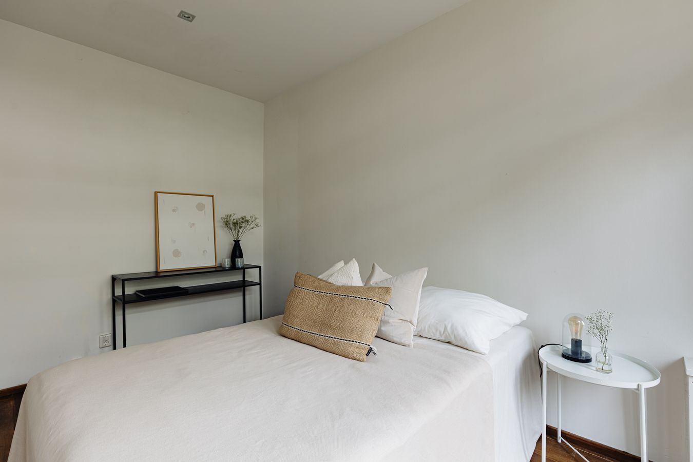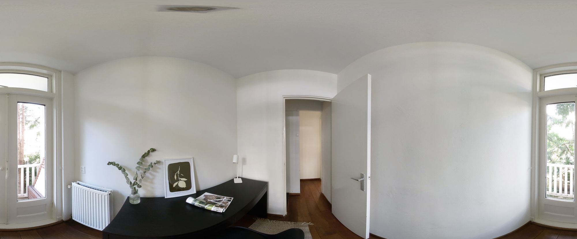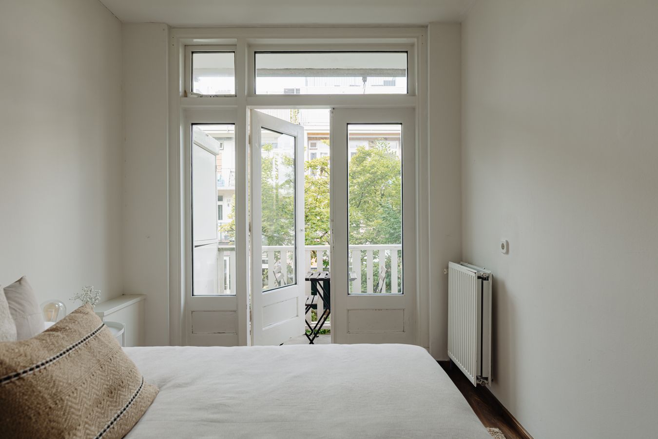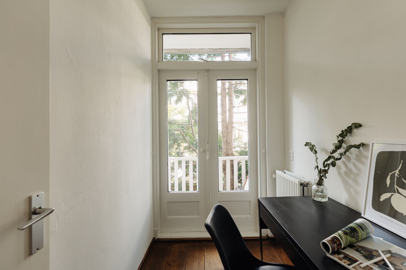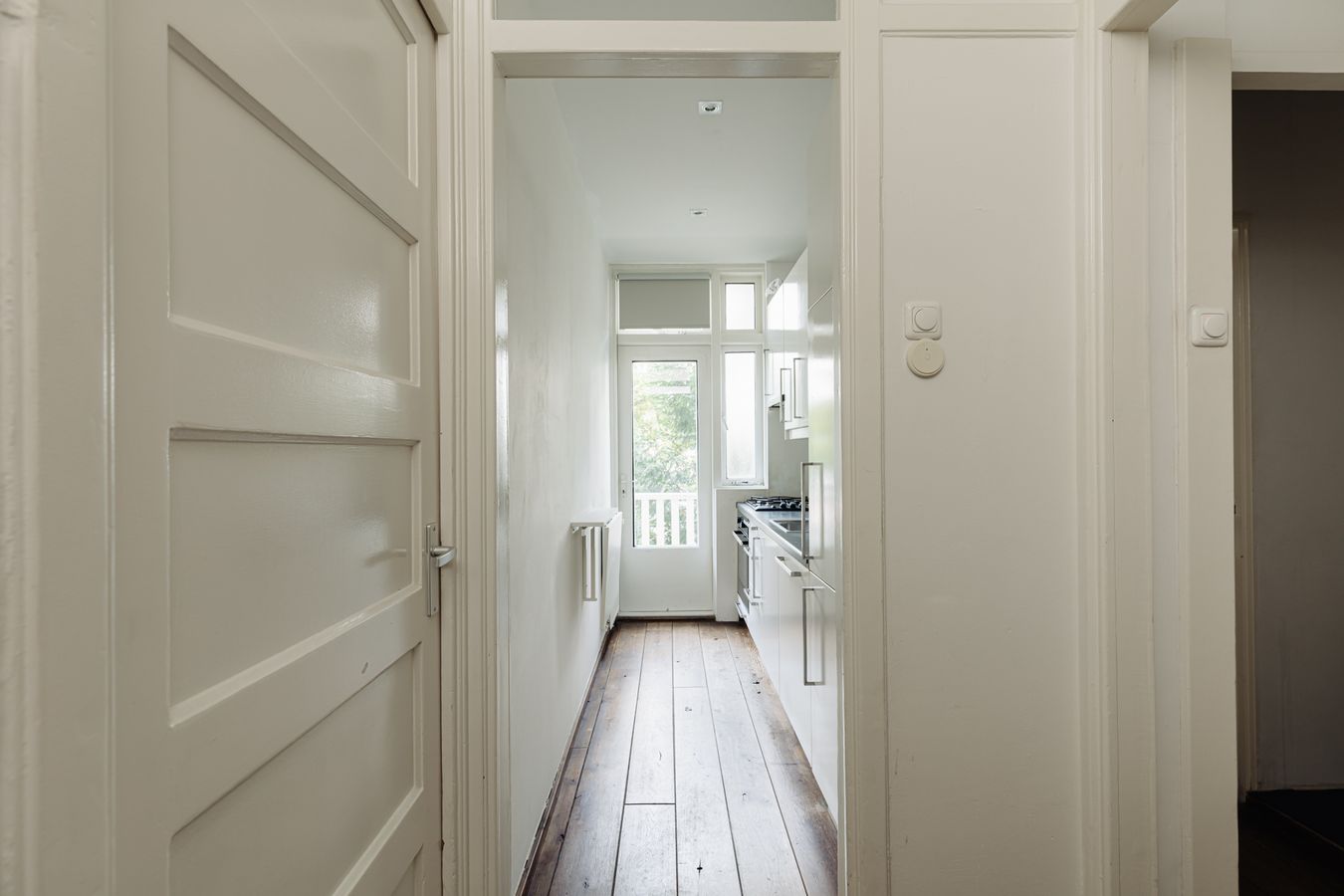 The kitchen and two bedrooms are located at the rear of the property. The first bedroom is approximately 10 m² and provides access to the balcony. The second bedroom is smaller in the current layout due to the extra hall where a washing machine can be placed. This room is therefore ideal for use as a home office, nursery and/or walk-in wardrobe. This room also has French doors leading to the balcony.