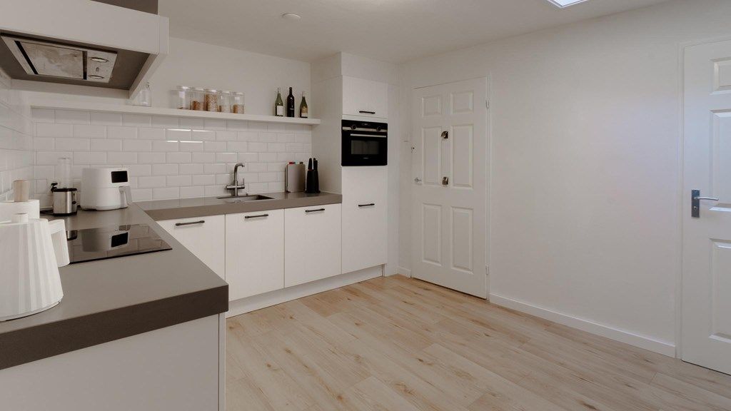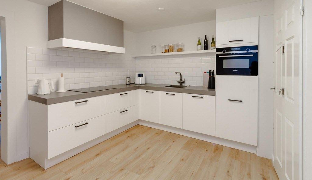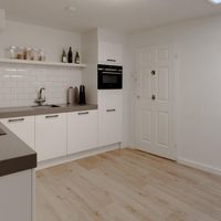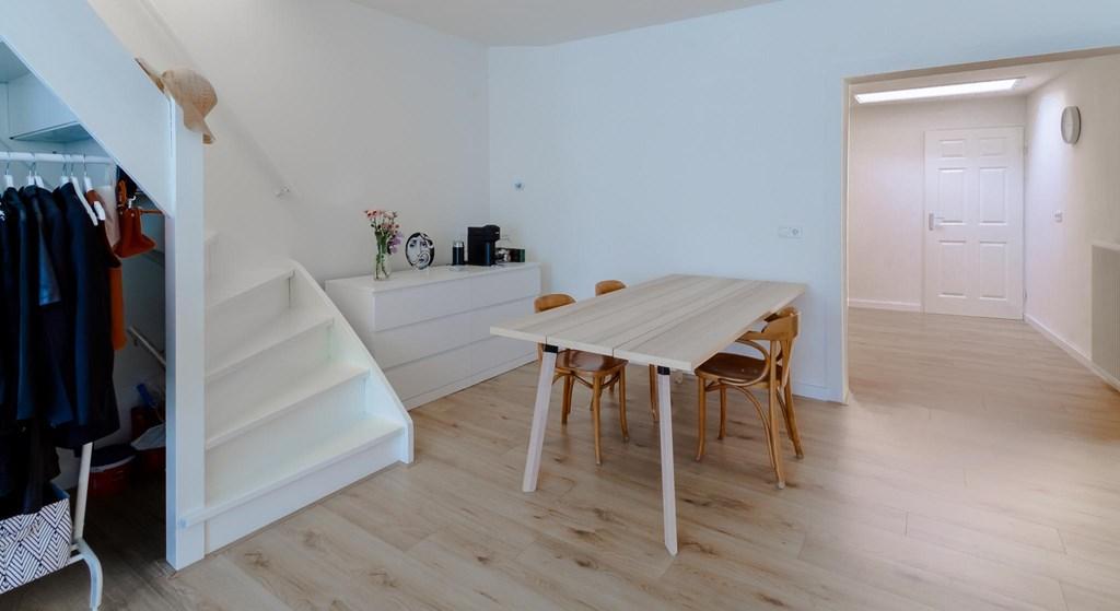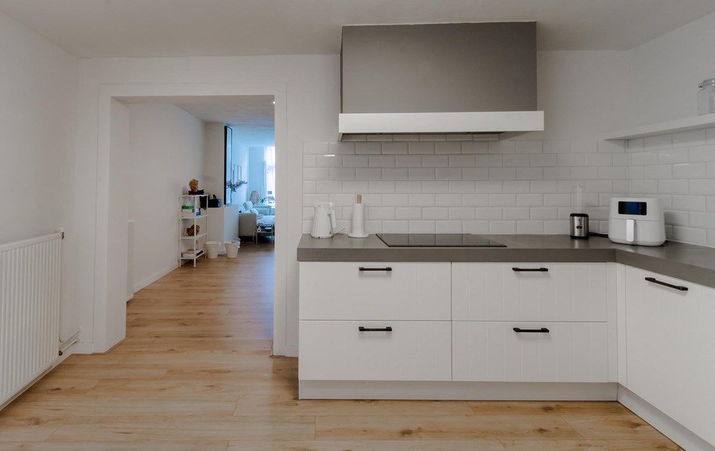 Entrance gives access to hall with door to the living room. This is very spacious and has a nice light through two large windows at the front. The space offers many possibilities and both a workspace and dining area can be created. At the rear of the living room is the semi-open, completely renovated kitchen. This has modern appliances such as a dishwasher, fridge/freezer, induction hob, extractor hood and built-in combination oven. The separate toilet can be reached from the kitchen, as well as the laundry/provision room.