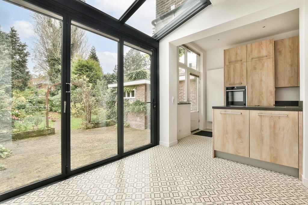 Via de entree kom je binnen in een fraaie hal met een granito vloer. Hier vind je een modern toilet. De woonkamer biedt een prachtig uitzicht op de kerk en is voorzien van een open haard, hoge plafonds en een houten vloer. De woonkamer loopt door naar de luxe serre, waarvan de pui volledig geopend kan worden. De open keuken is voorzien van moderne inbouwapparatuur en zowel de keuken als de serre hebben een stijlvolle tegelvloer. Vanuit de serre is er toegang tot de tuin, en via de tuin heb je toegang tot de garage.