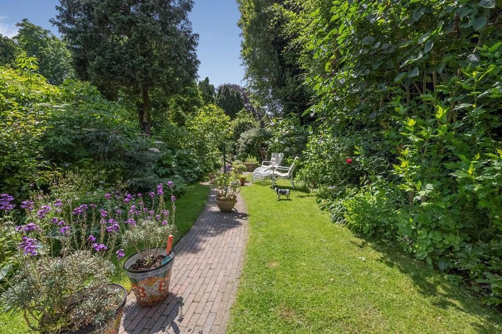 De woning beschikt over een eigen oprit met ruimte voor meerdere auto's en directe toegang tot de garage. Aan de voorkant van het huis is er vrij uitzicht op de kerk. Aan de achterzijde van de woning bevindt zich de 30 meter diepe, op het zuiden gelegen tuin met adembenemend uitzicht. De fraai aangelegde tuin heeft twee terrassen, diverse beplantingen en een groot gazon, waar je volop kunt genieten van de zon en de rust.