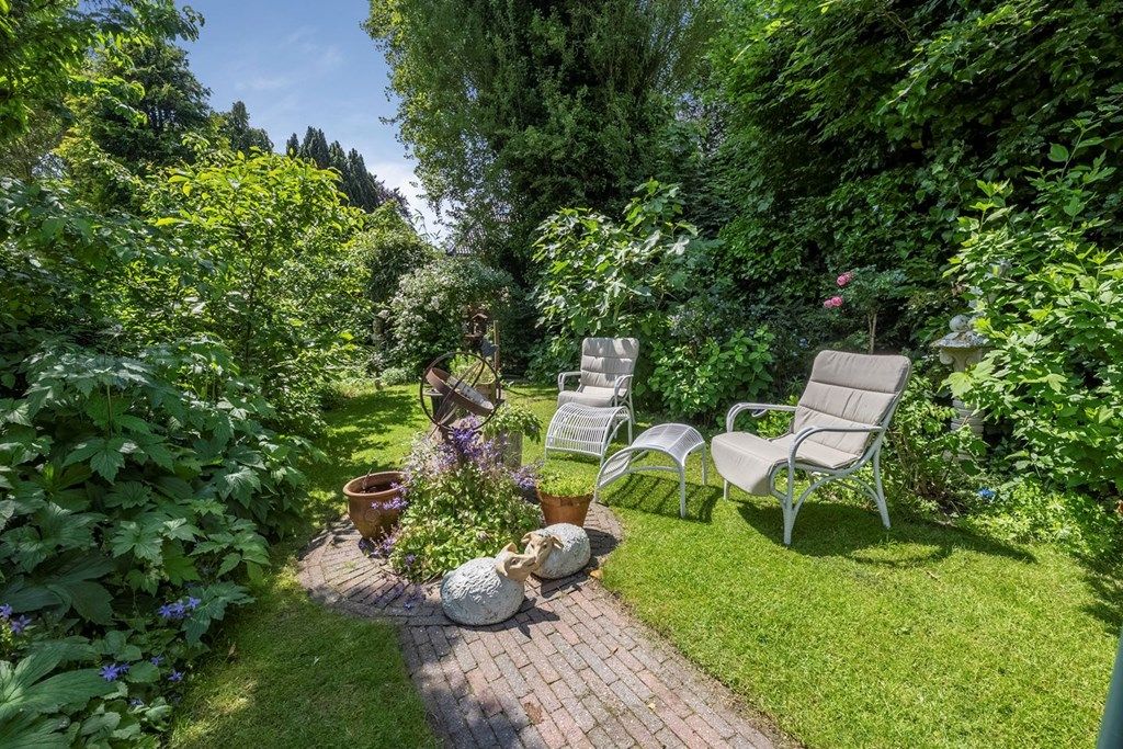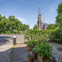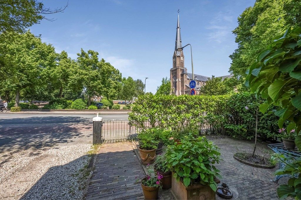 De woning beschikt over een eigen oprit met ruimte voor meerdere auto's en directe toegang tot de garage. Aan de voorkant van het huis is er vrij uitzicht op de kerk. Aan de achterzijde van de woning bevindt zich de 30 meter diepe, op het zuiden gelegen tuin met adembenemend uitzicht. De fraai aangelegde tuin heeft twee terrassen, diverse beplantingen en een groot gazon, waar je volop kunt genieten van de zon en de rust.