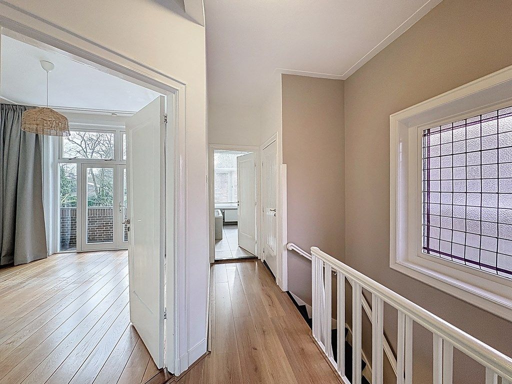 Op de ruime overloop bevindt zich een groot glas in lood raam, een modern toilet en een bergkast. Er is een zijkamer en twee slaapkamers, één aan de voorzijde met toegang tot een balkon, en één aan de achterzijde die eveneens over een balkon beschikt. De moderne badkamer, die in 2021 is vernieuwd, is voorzien van een inloopdouche, een wastafelmeubel en een bad.
