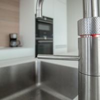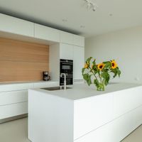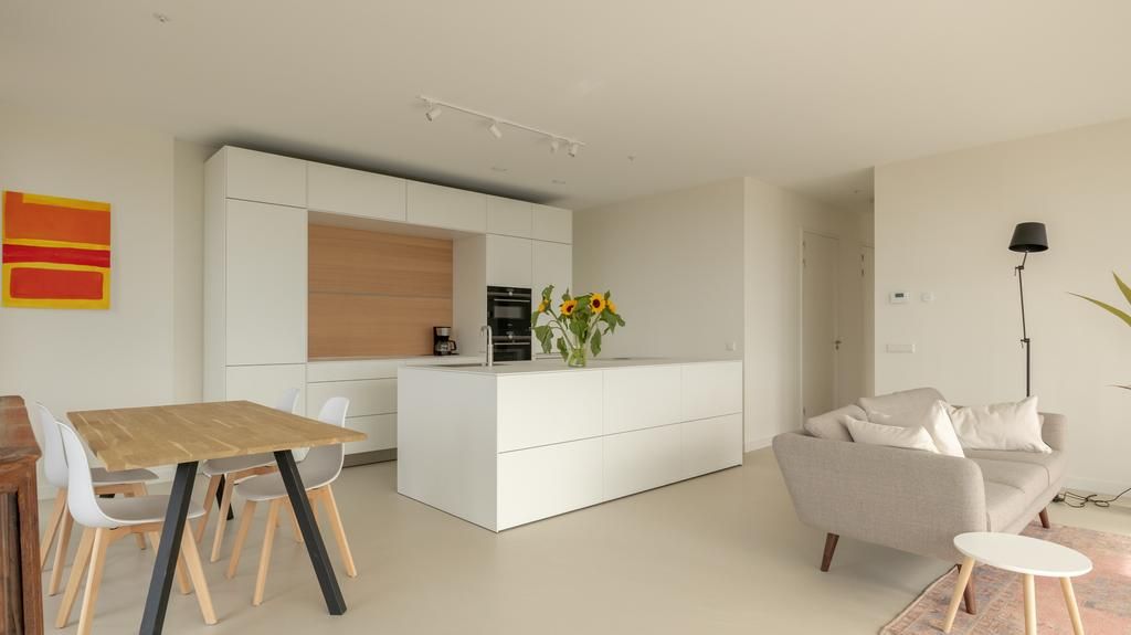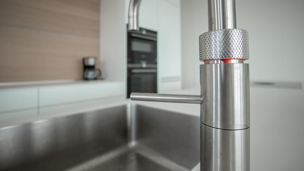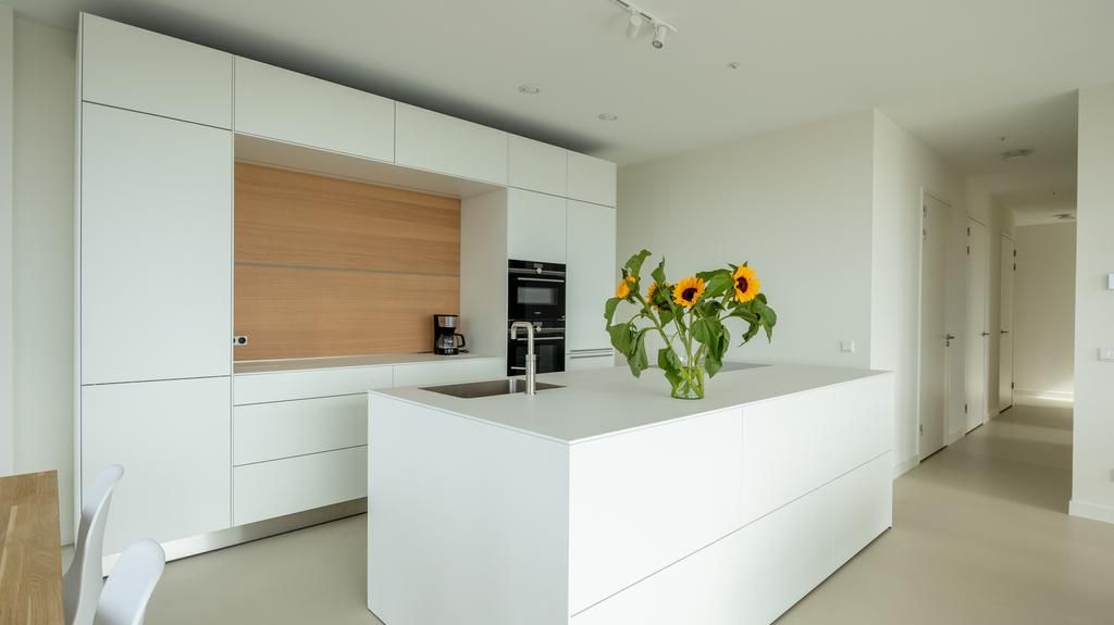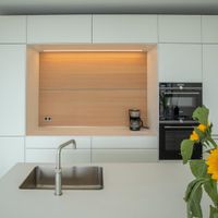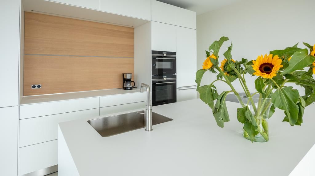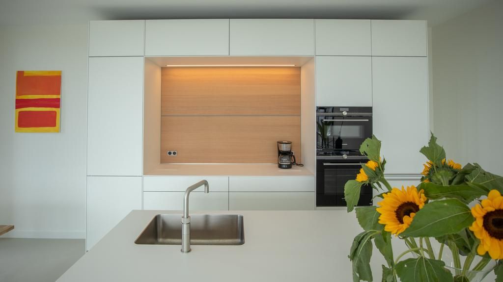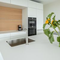 De moderne keuken is van alle gemak voorzien waaronder een inductie kookplaat met geïntegreerde afzuiging, Quooker voor direct kokend water, vaatwasser, volwaardige (slimme) oven, separate magnetron en koel- vriescombinatie.