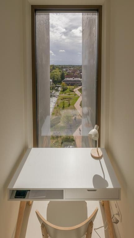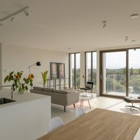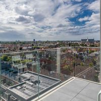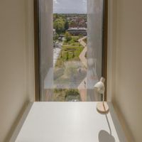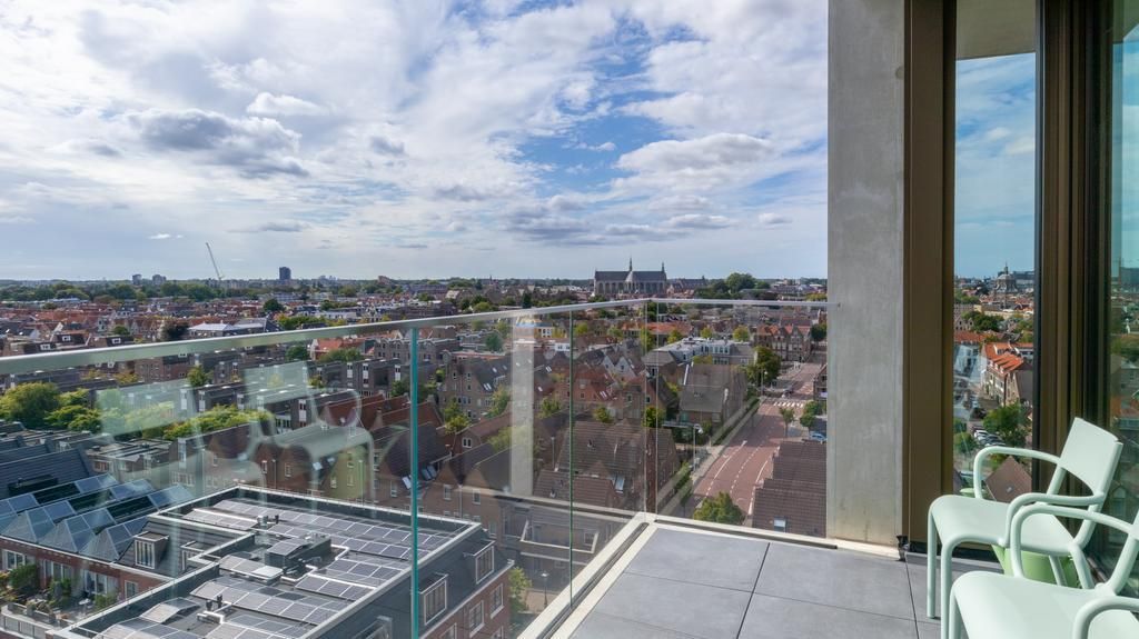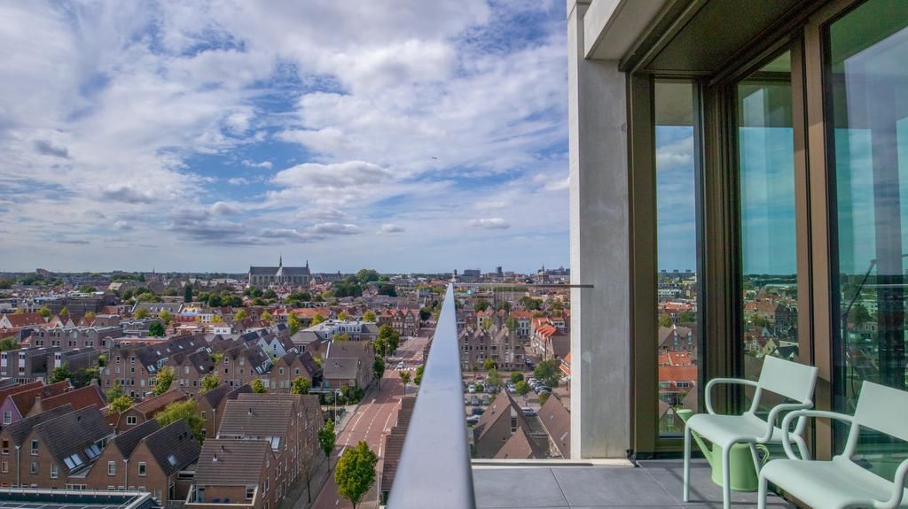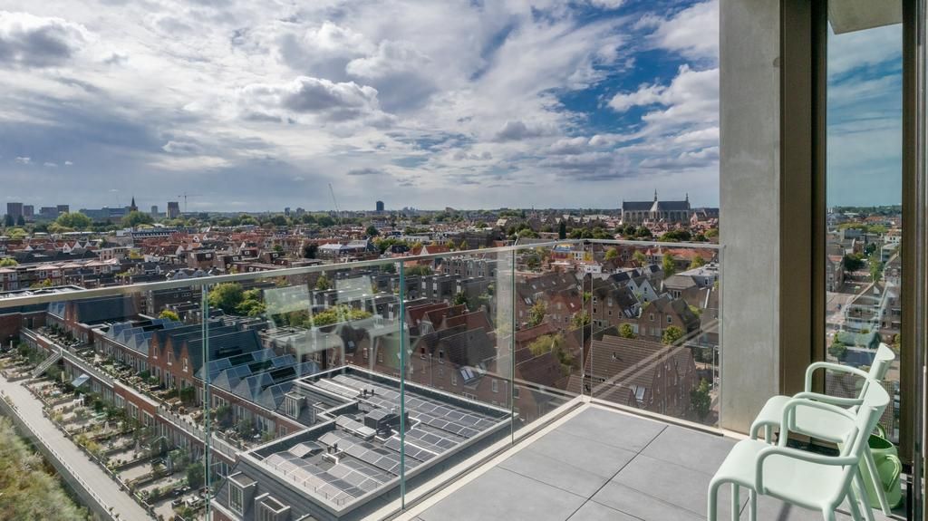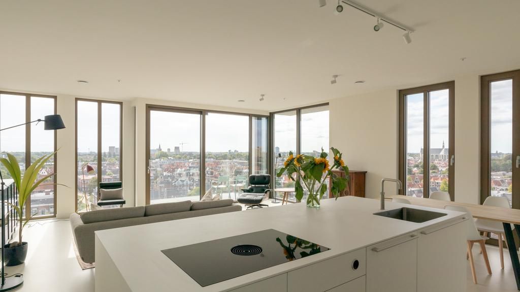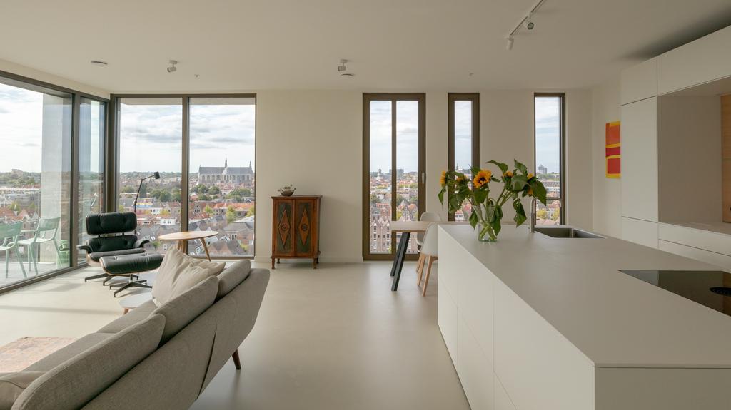 De gezamenlijke entree geeft middels twee liften of het trappenhuis toegang tot het bijzondere appartement. De centrale hal is ruim opgezet en geeft toegang aan alle ruimtes waaronder het separate toilet en werkplek met het mooiste uitzicht van Leiden. De ruime en bijzonder lichte woonkamer is met ramen rondom en geeft het hele jaar de hele dag prachtig zicht op de stad en parken. De ligging is op het Zuiden én Westen en daarmee bijzonder licht zonder dat het oncomfortabel warm wordt binnen. Het energielabel is namelijk A++ en met vloerkoeling een zeer aangenaam klimaat. Het balkon heeft een prettige grootte en de glazen balustrade zorgt voor on-geïnterrumpeerd zicht rondom.
