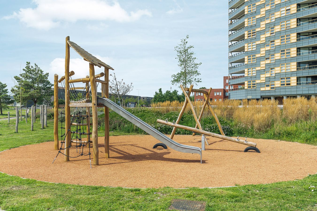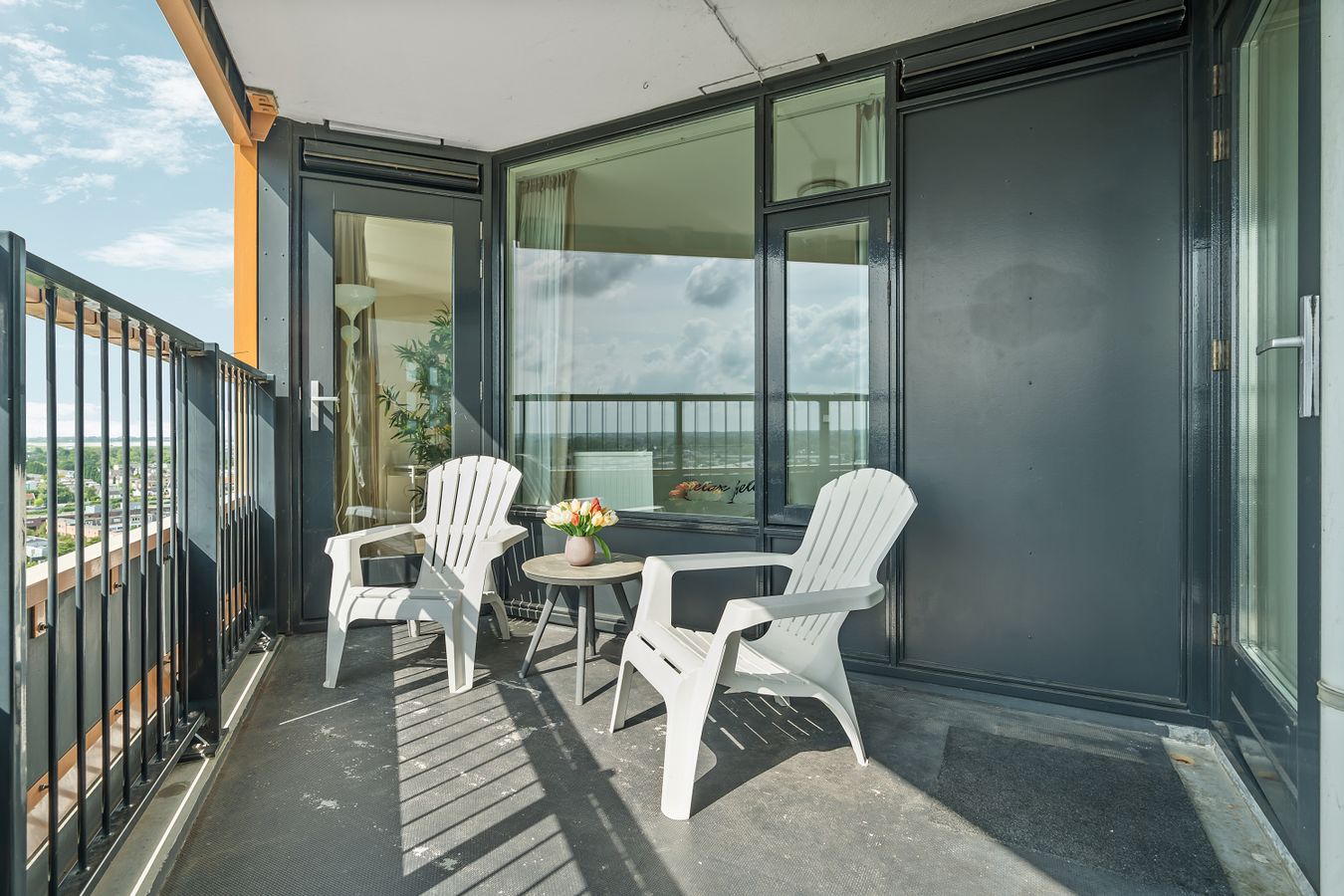 Het balkon is gelegen op het zuiden. Hier zit je de hele dag in de zon en geniet je van het prachtige uitzicht op zowel de Zuidas, het Amsterdamse Bos als Schiphol.