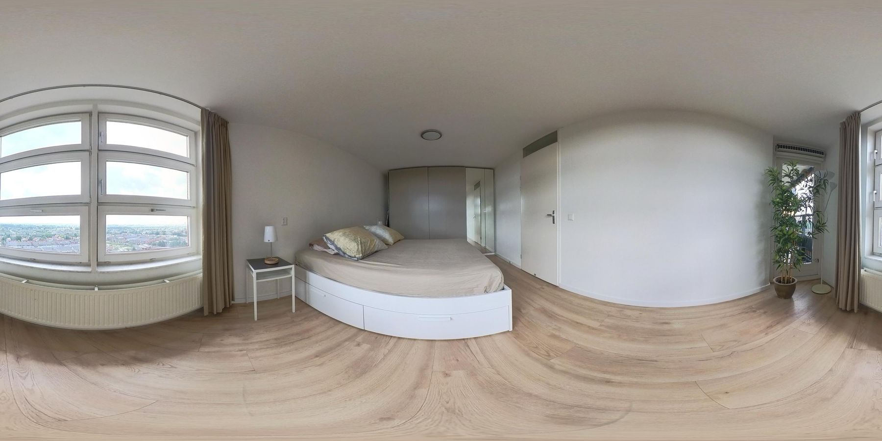 De grote slaapkamer bevindt zich aan de rechterzijde van het appartement en bestrijkt ca. 15m². Deze kamer beschikt over een grote kledingkast en ruim plek voor een tweepersoonsbed. Zowel via deze kamer als de woonkamer is het balkon te bereiken.