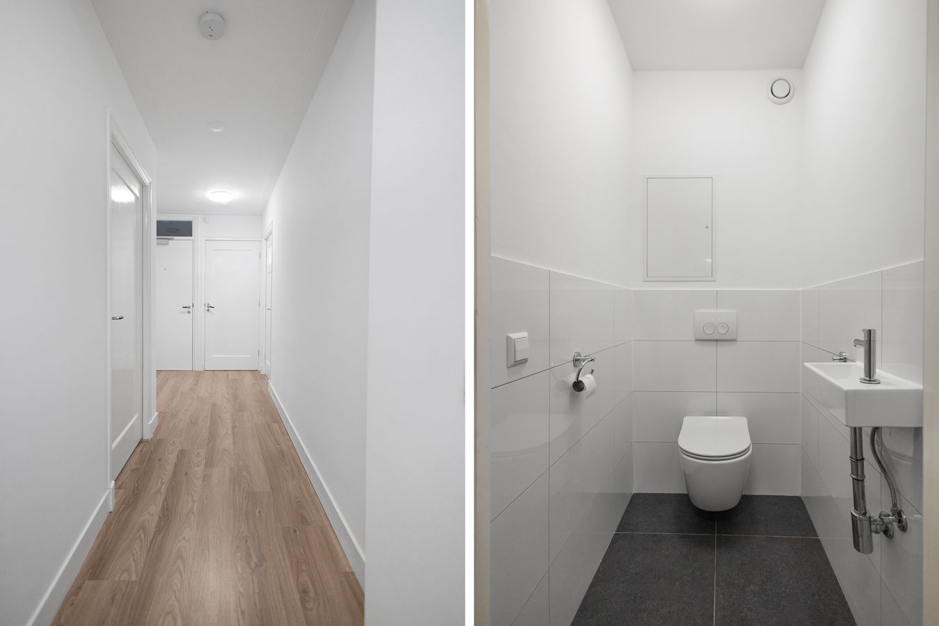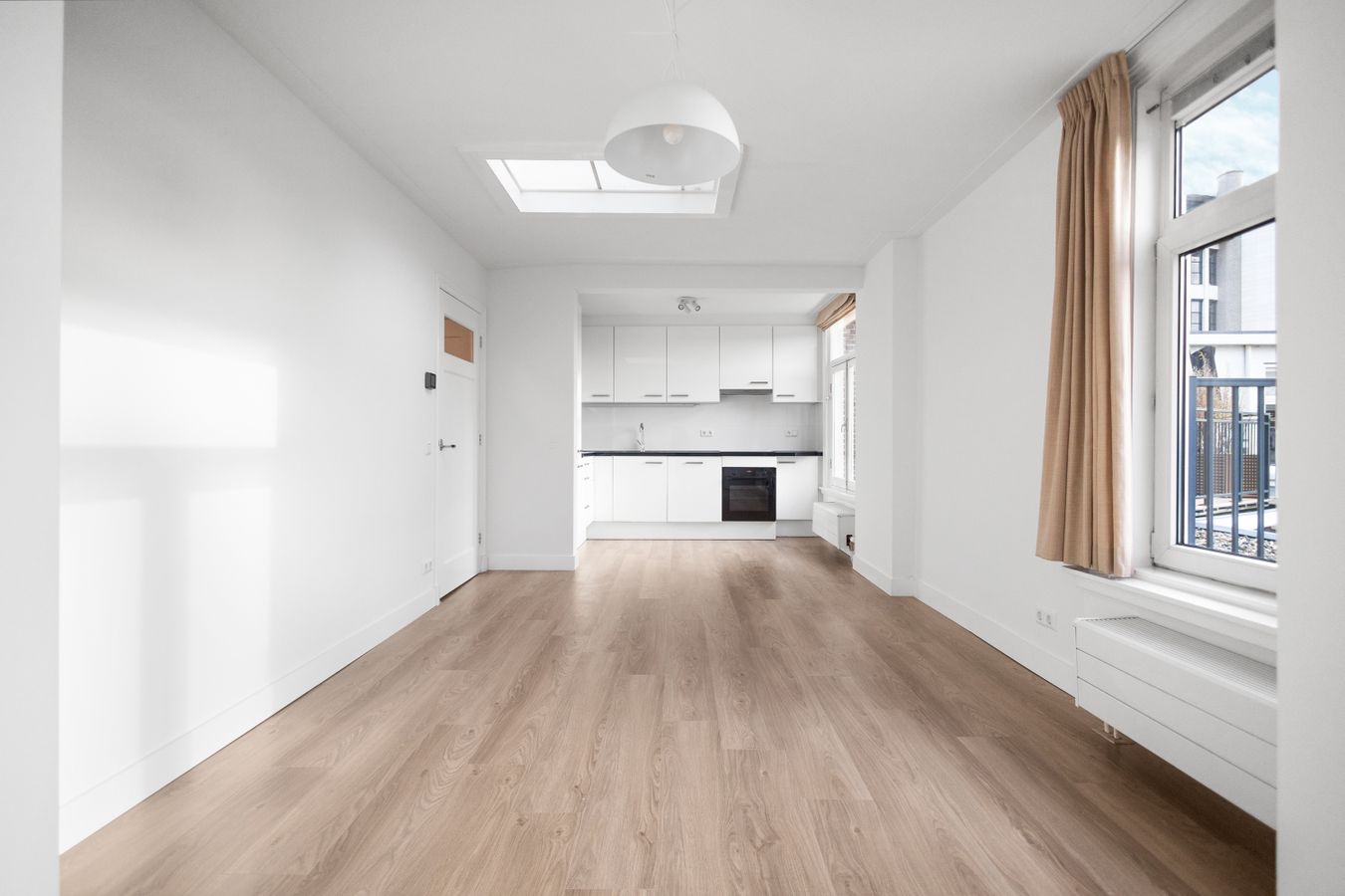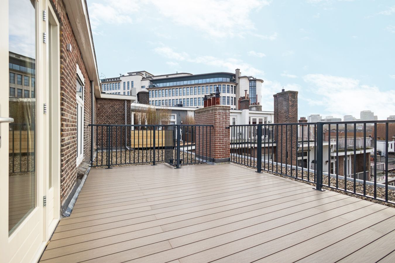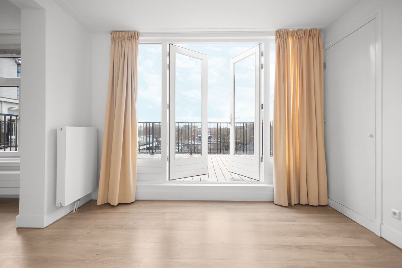 De ruime en lichte entree/hal geeft toegang tot alle vertrekken. De langwerpige woonkamer ligt aan de achterzijde van het pand en kenmerkt zich door de vele raampartijen die zorgen voor een prachtige lichtinval. Via openslaande deuren bereikt u het zeer ruime dakterras op het zuidwesten. Met uitzicht op de groene binnentuinen is dit een heerlijke plek om te genieten van de middag- en avondzon. De moderne open keuken is volledig uitgerust met een inductiekookplaat, oven-/magnetroncombinatie, koelkast, vriezer en vaatwasser. Op deze verdieping bevinden zich tevens twee slaapkamers aan de voorzijde van de woning en een ruime badkamer met inloopdouche.
