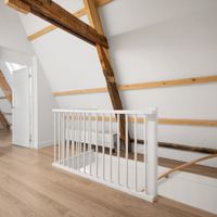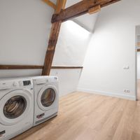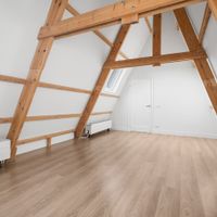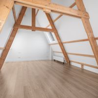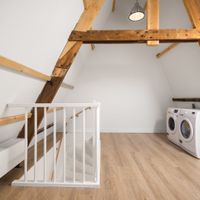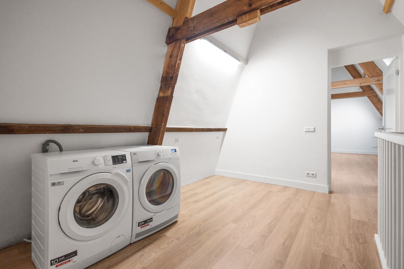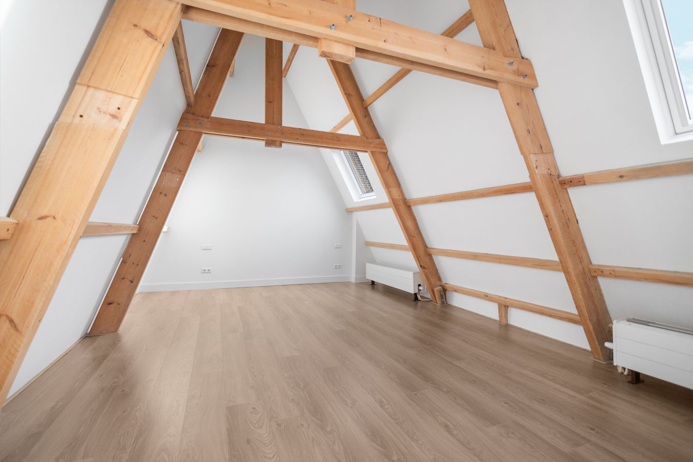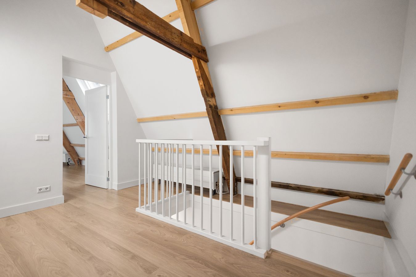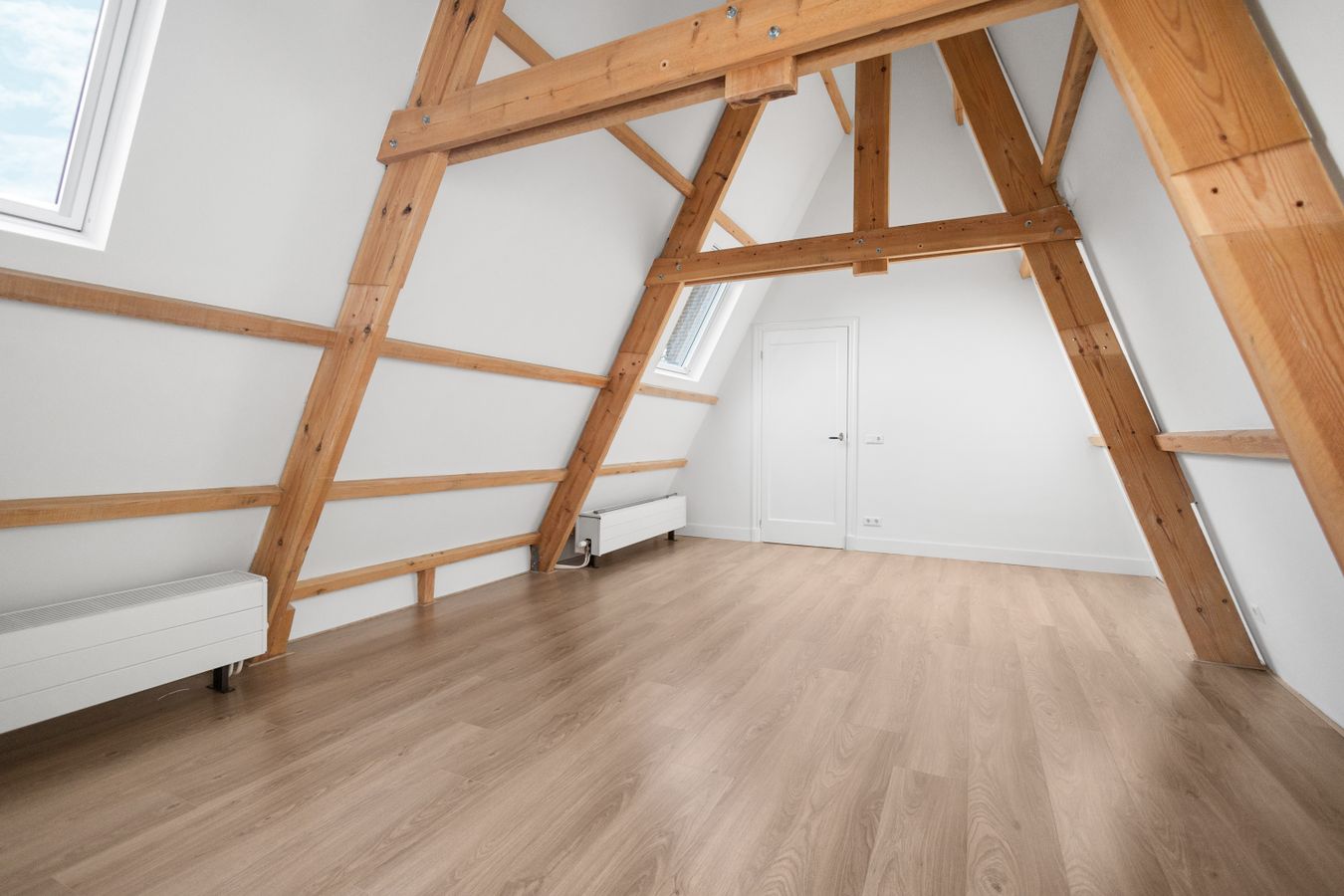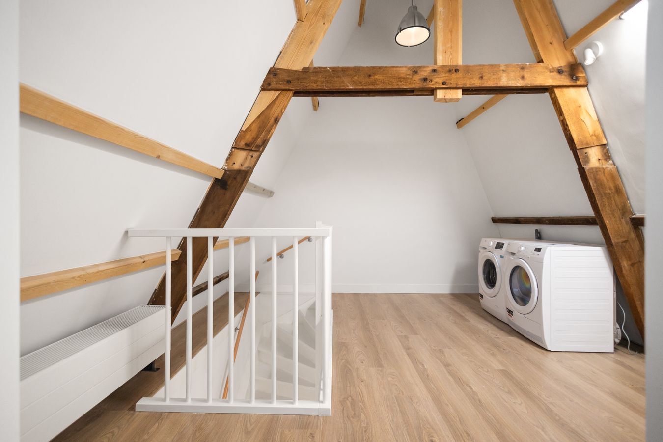 Middels een trap wordt de bovenste verdieping bereikt, waar zich een zeer ruime derde slaapkamer bevindt. De hoogte en de prachtige houten balken geven deze ruimte een unieke en karakteristieke uitstraling. Op de ruime overloop zijn daarnaast een wasmachine en droger geplaatst.