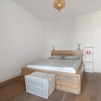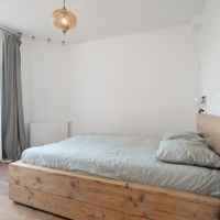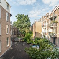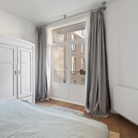 Aan de achterzijde van de woning bevinden zich twee slaapkamers, een ruime badkamer met toilet en een separaat toilet. De master bedroom (ca. 14m²) heeft een sfeervolle schouw en biedt directe toegang tot het zonnige balkon op het zuidwesten en zicht op de groene binnentuin. De tweede kamer fungeert ideaal als slaap-, werk- of logeerkamer.