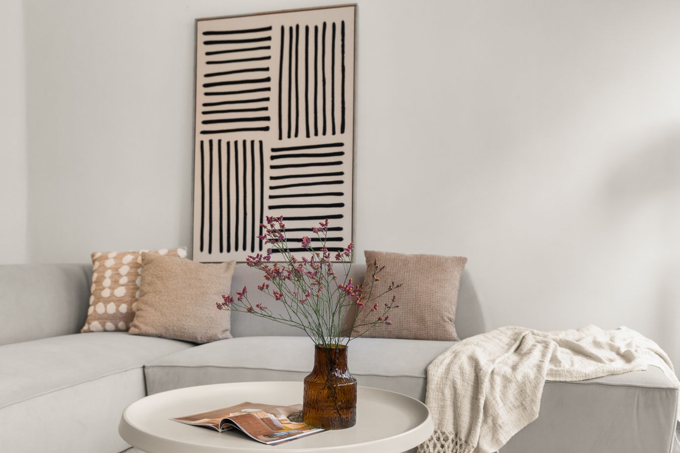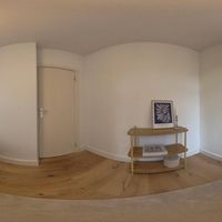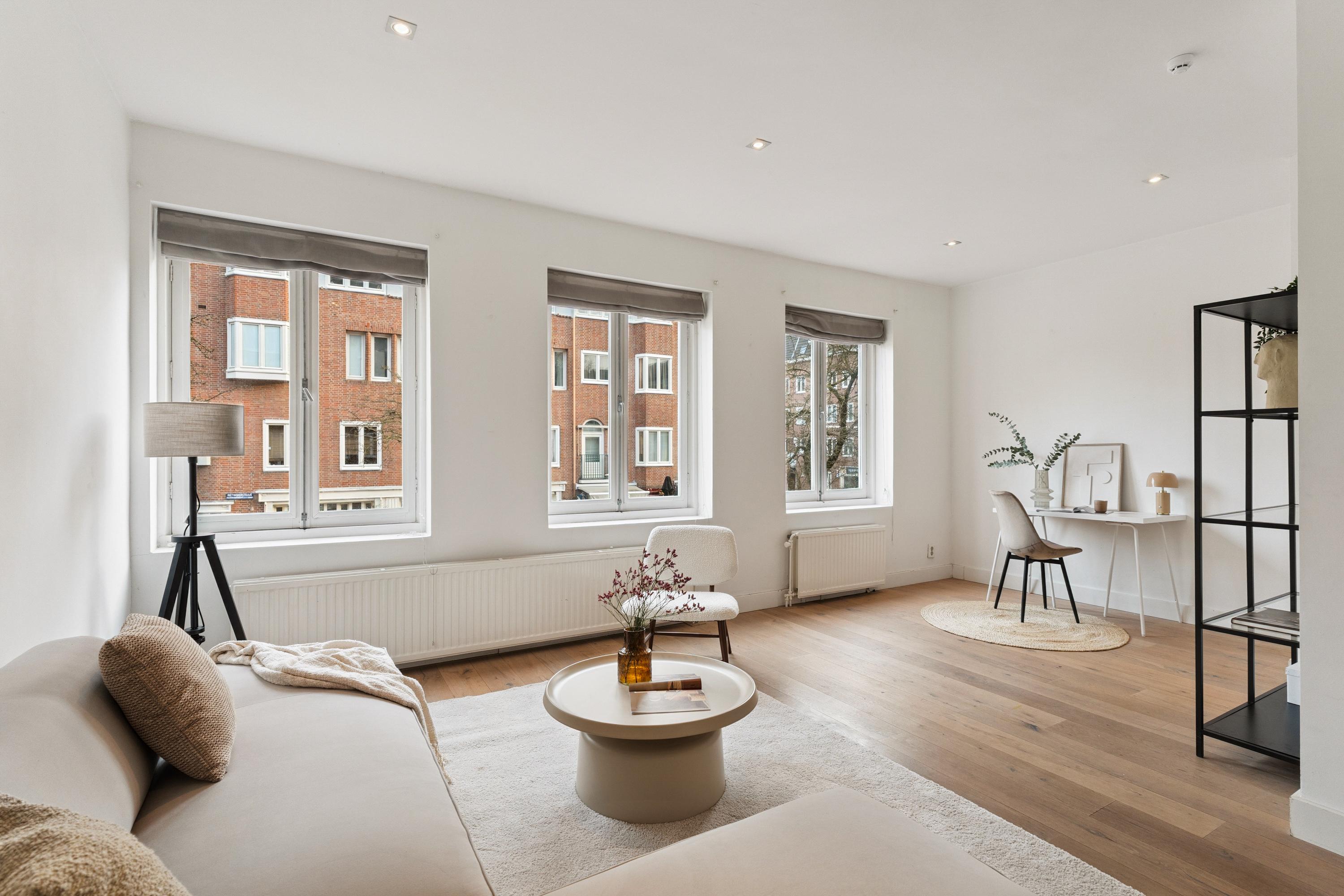 De gezamenlijke entree geeft toegang tot de eerste verdieping. Bij binnenkomst valt direct de prettige lichtinval in de woning op. De L-vormige woonkamer aan de voorzijde is licht en ruim opgezet. Mede vanwege de gunstige ligging op de hoek geniet deze ruimte veel natuurlijk daglicht.