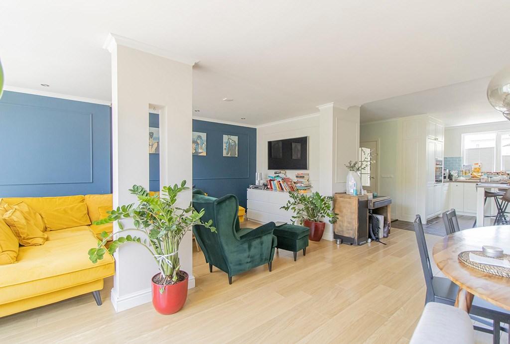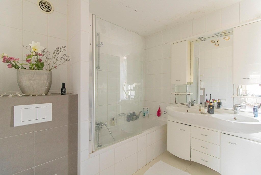 Through the entrance hall, which includes a modern toilet and access to the storage room (also reachable via a separate front door — perfect for bicycles or extra storage), you enter the heart of the home. At the front of the house, you’ll find a contemporary open kitchen, equipped with an induction hob, dishwasher, extractor hood, and combi-oven. The spacious living room at the rear is flooded with natural light and opens directly onto the sunny south-facing garden, providing a peaceful retreat.