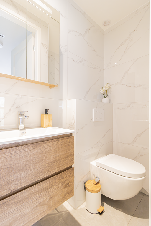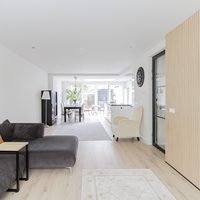 Via de entree met garderobe en modern toilet met fonteintje bereikt u de lichte en ruime woonkamer.