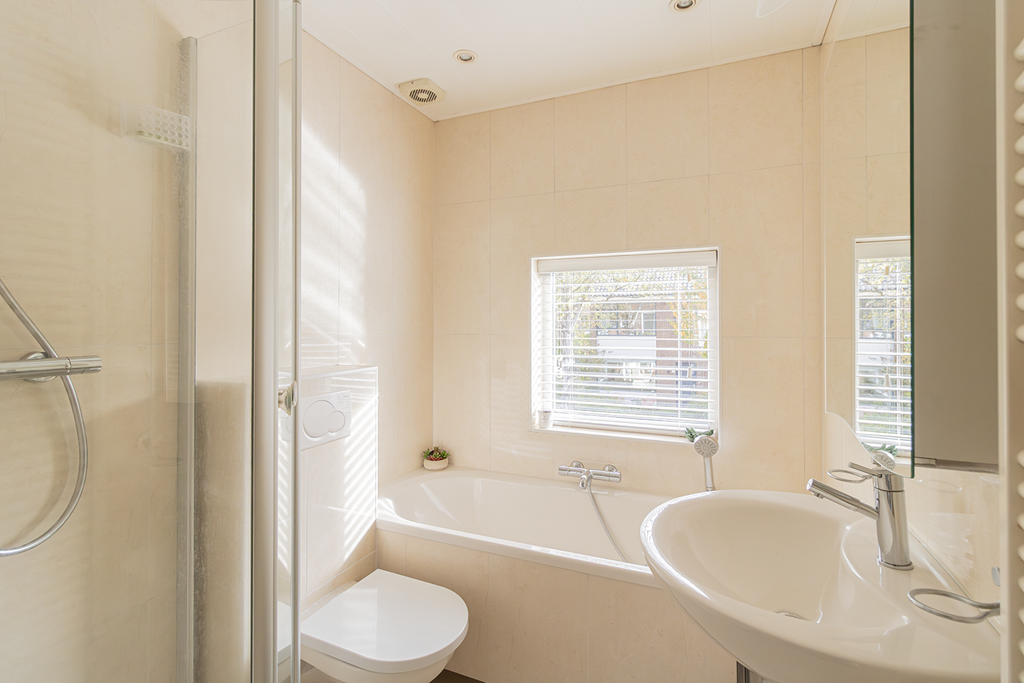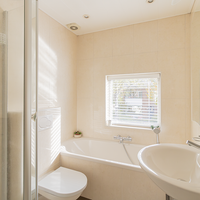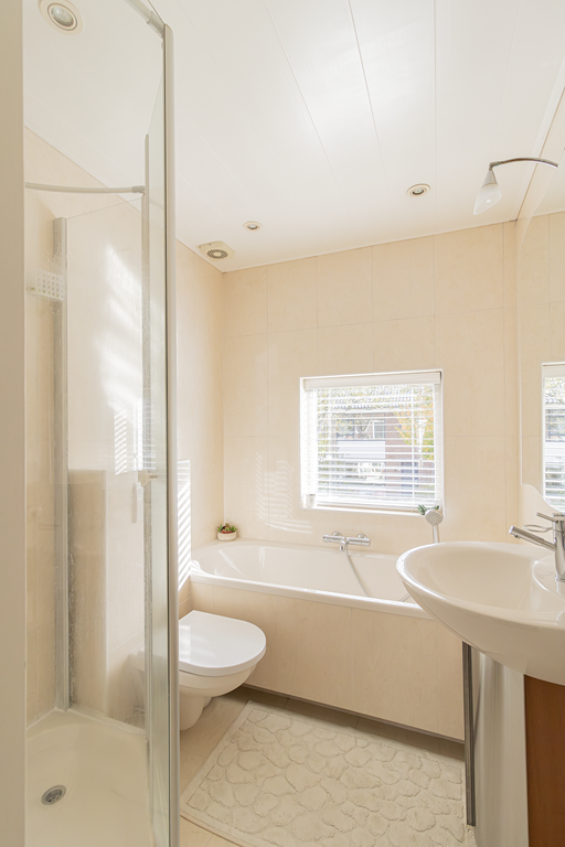 De overloop biedt toegang tot drie slaapkamers en badkamer. De badkamer is voorzien van een douche, ligbad, wastafelmeubel en een tweede toilet.