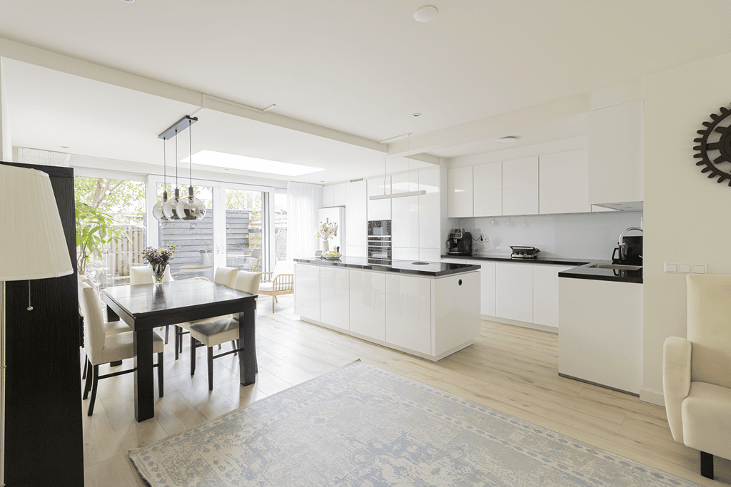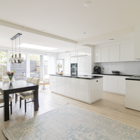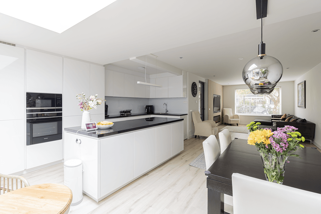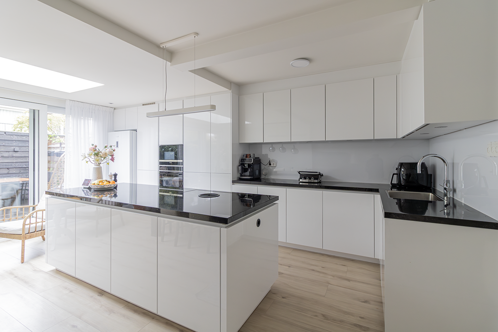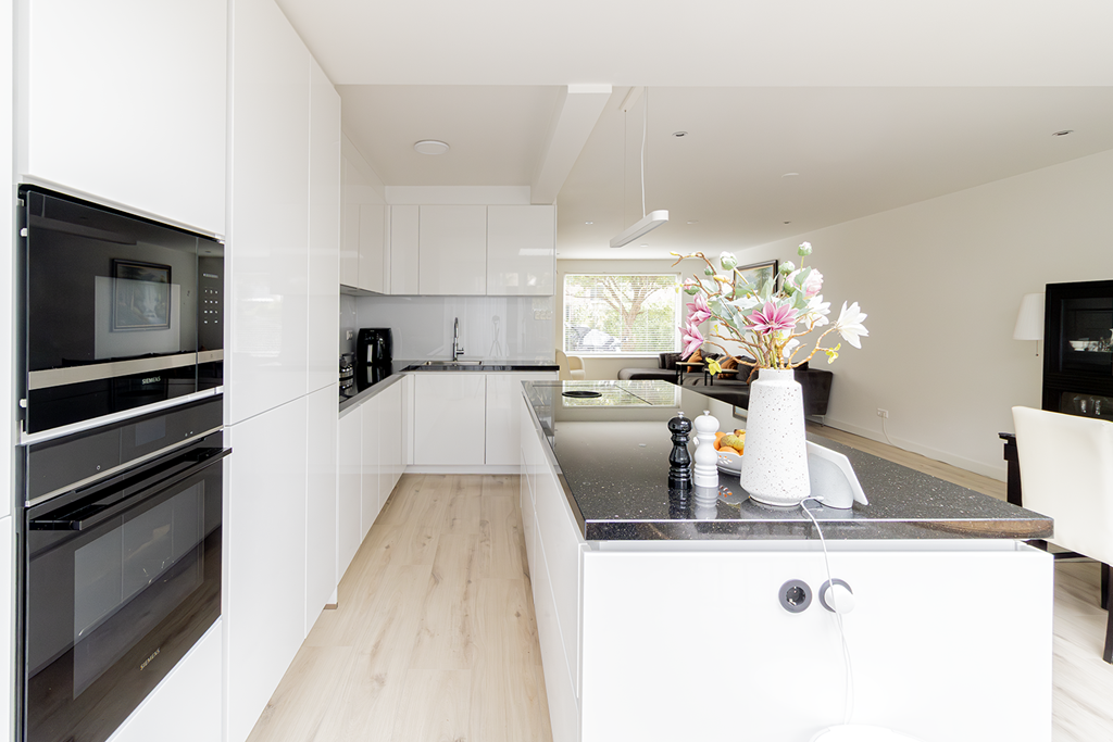 De moderne open keuken aan de achterzijde is een echte eyecatcher. Deze is uitgevoerd met een stijlvol kookeiland en voorzien van hoogwaardige inbouwapparatuur. Het eiland beschikt over een 4-pits inductiekookplaat van het merk BORA, met een geïntegreerd afzuigsysteem.