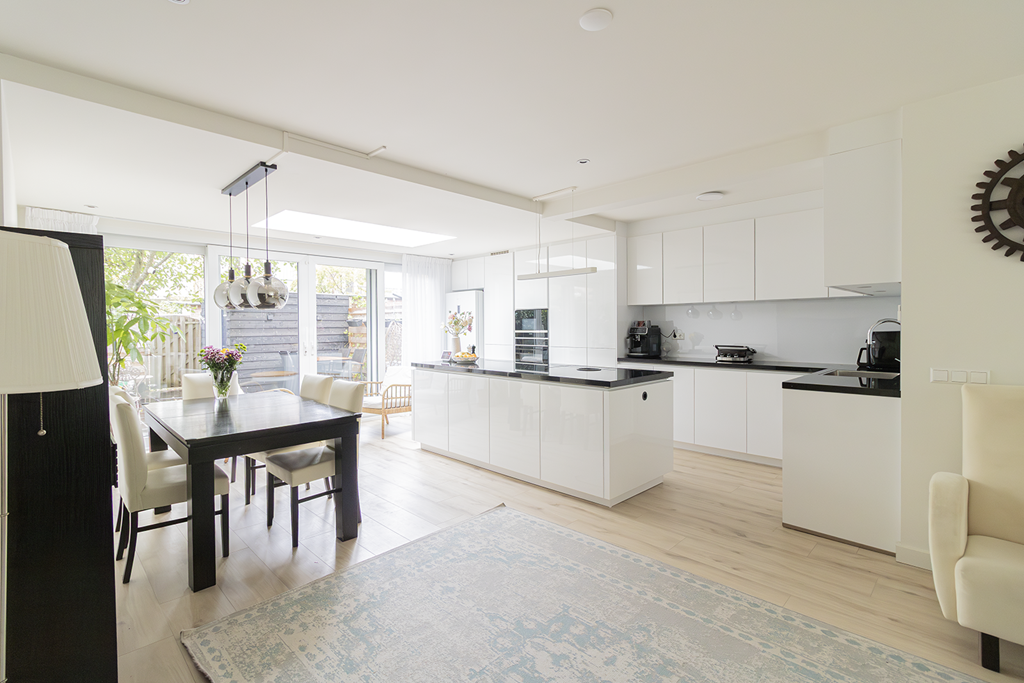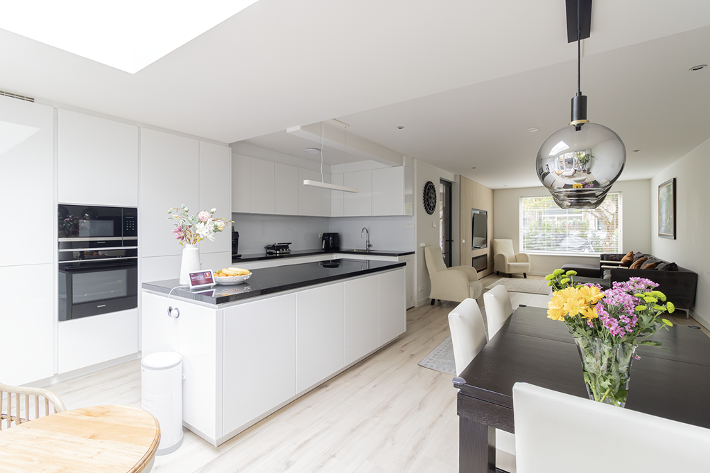 Verder is de keuken uitgerust met een combi-oven, vaatwasser, koelkast met aparte vriezer en veel kastruimte. Direct naast de eettafel bevindt zich een schuifpui, die toegang geeft tot het zonnige terras en tuin op het westen.