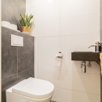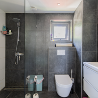 met walk-in-closet (ca. 8 m2) en gedeelde moderne badkamer en toilet. De badkamer is ingedeeld met een grote inloopdouche, een wastafelmeubel met spiegel.