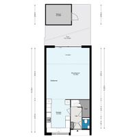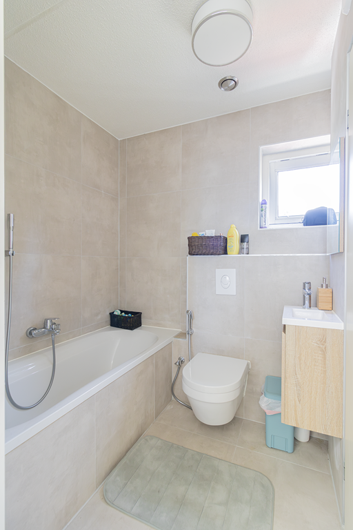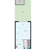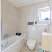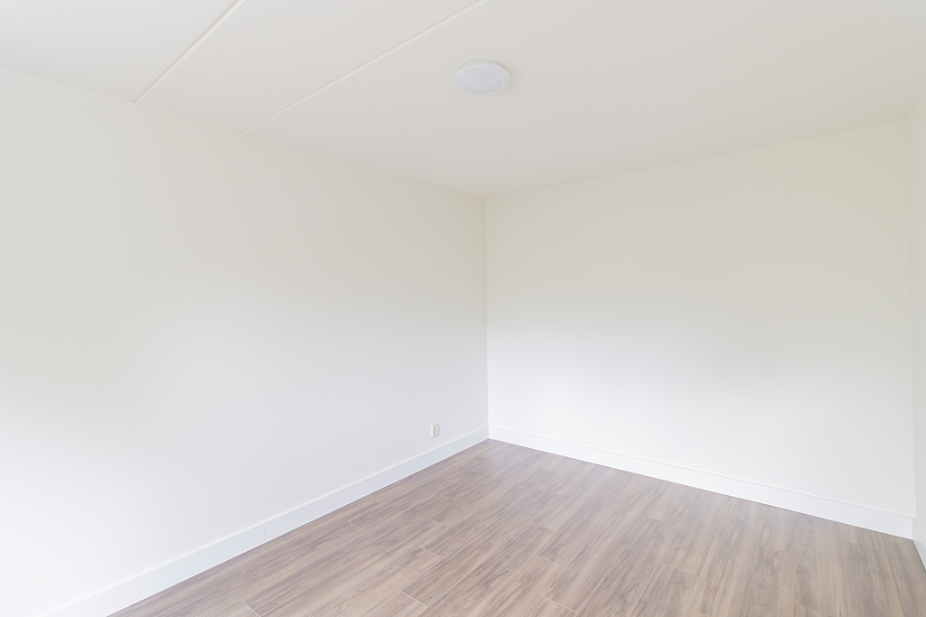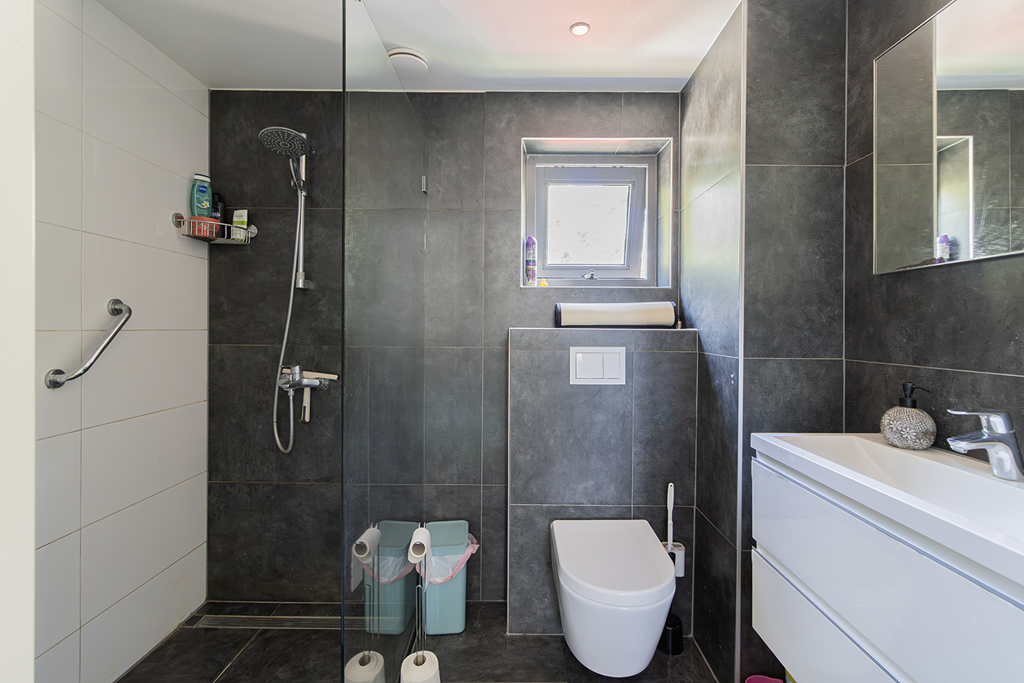 bemeten (ca. 20 m2) en voorzien van een woning brede glazen achterpui met openslaande deuren. De badkamer is ingedeeld met een grote inloopdouche, een