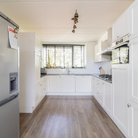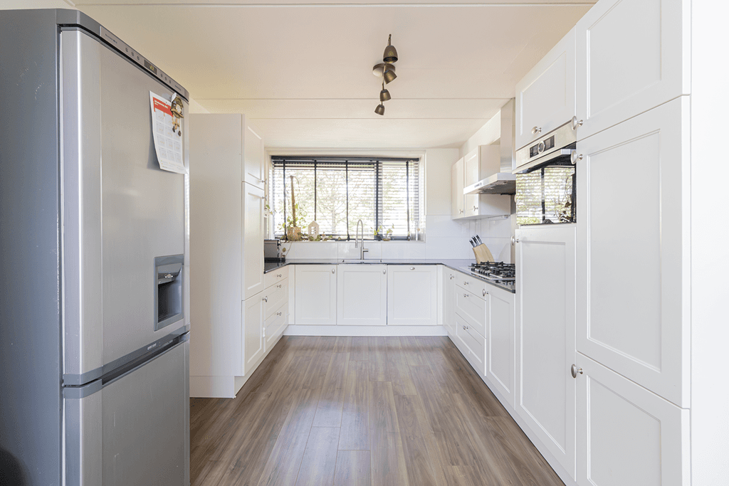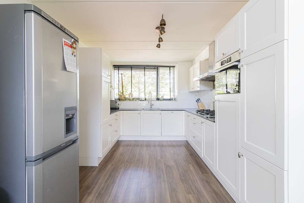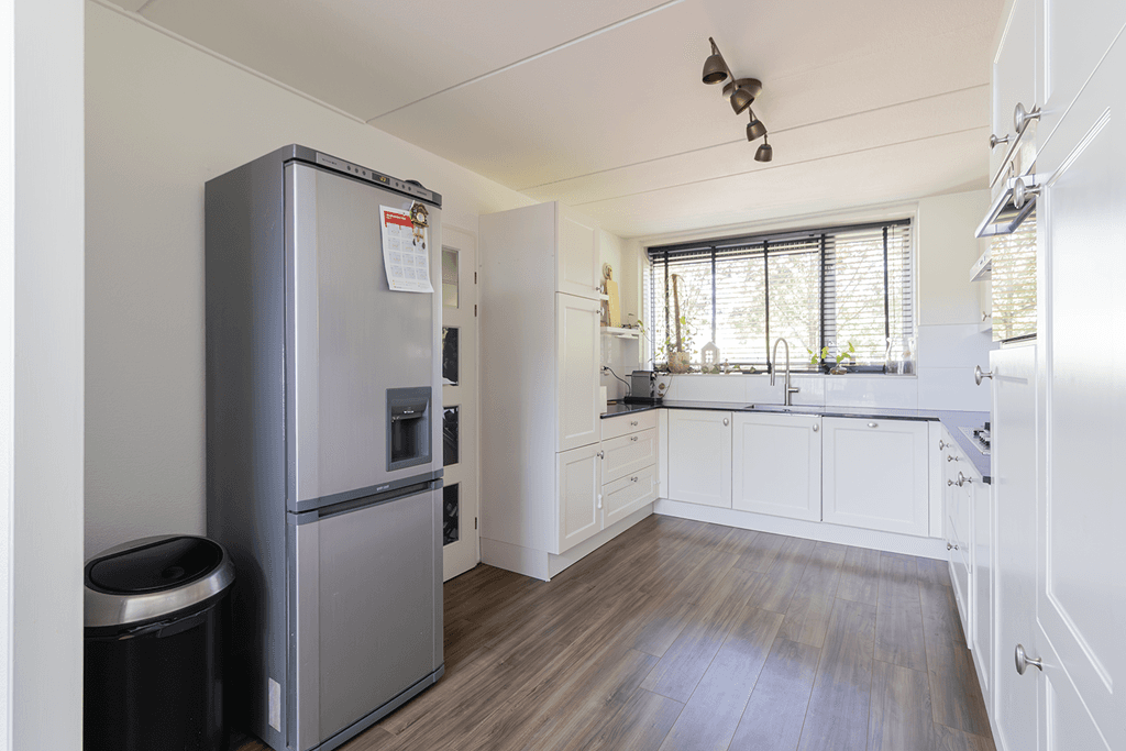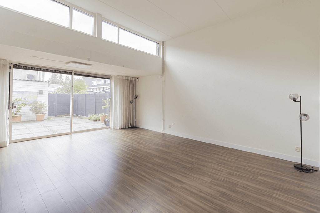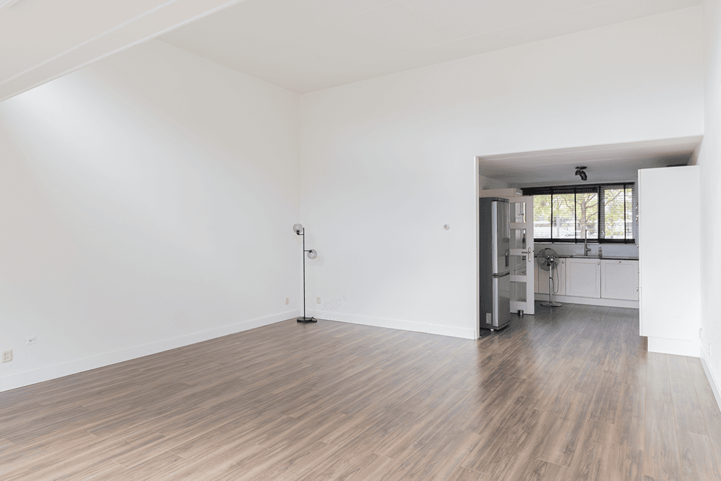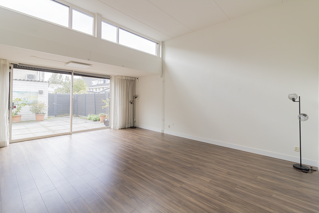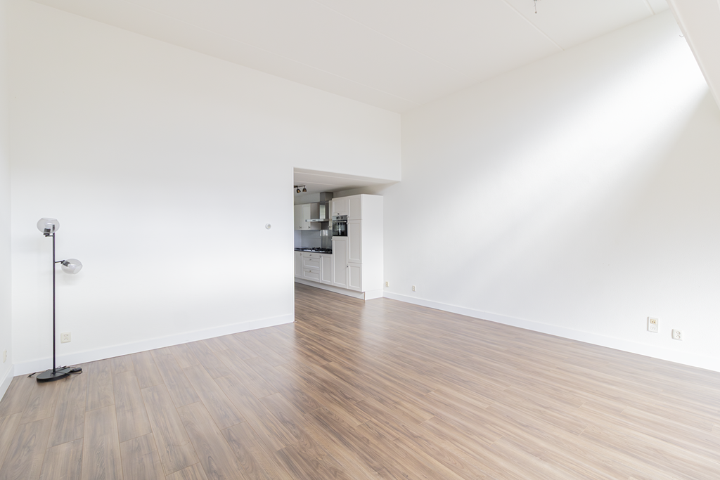 plafondhoogte draagt bij aan een zeer lichte uitstraling in alle vertrekken. De keuken is open en staat in verbinding met de ruime woonkamer waarbij de plafondhoogte van bijna 4 meter een ware eye-catcher is.