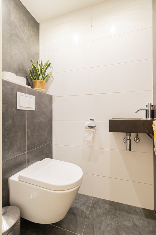 Via eigen voortuin toegang tot de inspringende voordeur, hal voorzien van moderne uitgebreide meterkast, separaat (gasten-)toilet voorzien van fonteintje, trapopgang met bergkast, glazen toegangsdeur naar open keuken. Moderne inbouwkeuken met bovenkasten en tegelwerk voorzien van alle gemakken