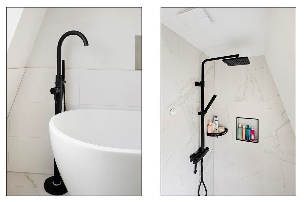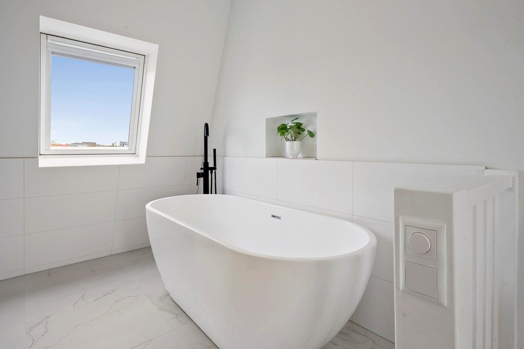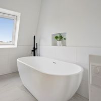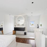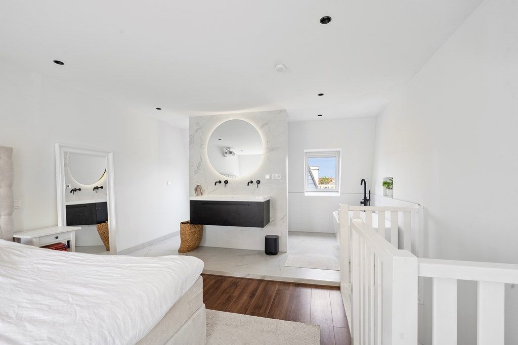 Op de eerste verdieping vind je twee slaapkamers, een inloopkast en een nette badkamer met inloopdouche en een wastafel met wastafelmeubel. De bovenste verdieping beschikt over een master bedroom met en-suite badkamer. Deze badkamer is voorzien van een inloopdouche, een ligbad, een dubbele wastafel met wastafelmeubel en een toilet.